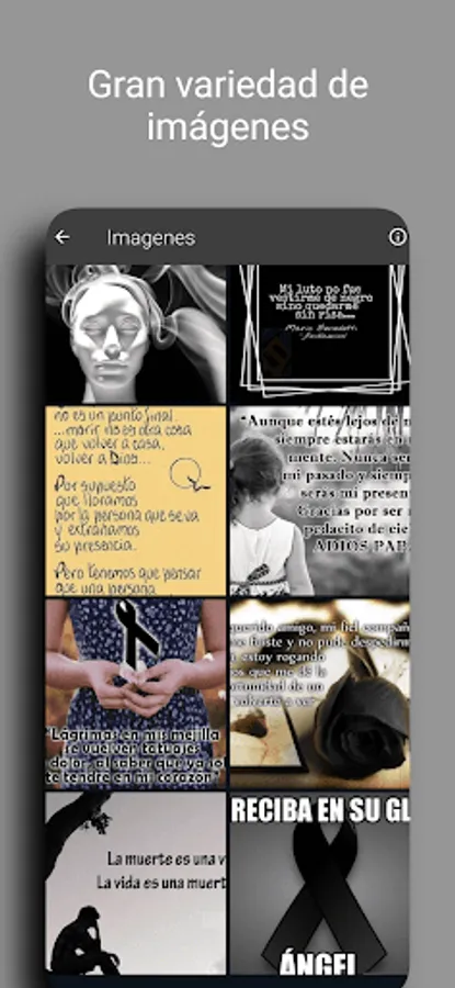 In summary, the mourning images application is a valuable tool for those who are going through the grieving process and who are looking for a way to express their grief and honor the memory of the deceased. With a wide selection of images, commemorative messages and send them to friends and family, thus helping those who have suffered a loss to feel accompanied in their pain and to overcome the grieving process.