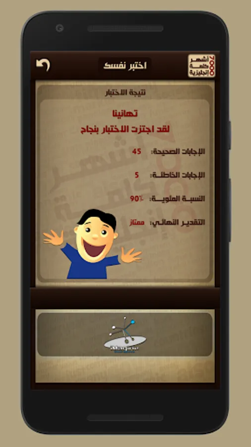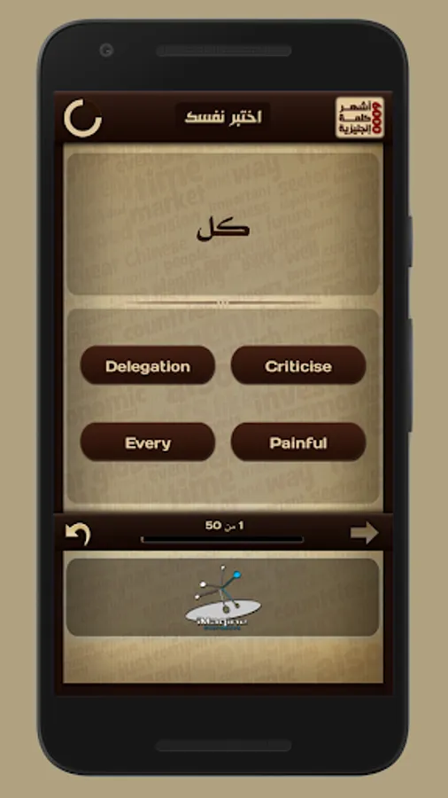 إختبر نفسك هي خاصية تتيح لك تقييم مستواك في الكلمات الإنجليزية وذلك عن طريق الإجابة عن ٥٠ سؤال لكل سؤال مهلة ١٠ ثواني للإجابة عليه مع عرض نتيجة الإختبار في نهاية الإختبار
