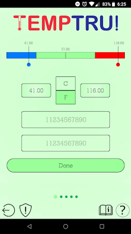 The app defaults to Fahrenheit units and allows the user to change units to Celsius.