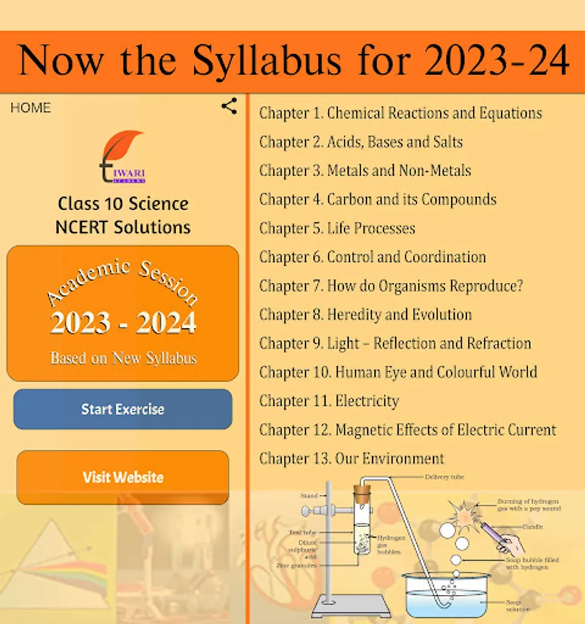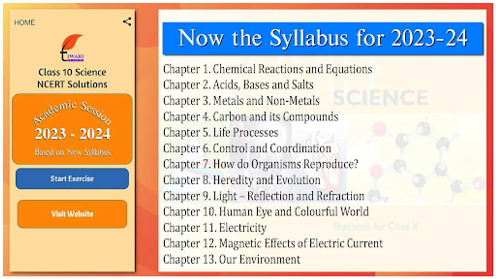 Note: Earlier there were 16 chapters in class 10 science syllabus but as per new NCERT textbooks issued for academic year 2023-24, there are only 13 chapters in 10th science curriculum. That is why, three chapters (which are out of syllabus) removed from the app. Apart from this, the topics are delete in rest of the chapters also. So, it is advice to follow new textbooks only for the preparation of 2023-24 exams. For any educational help, feel free to contact us.