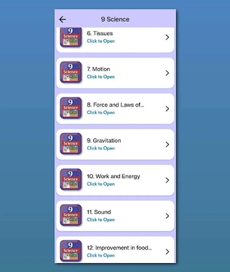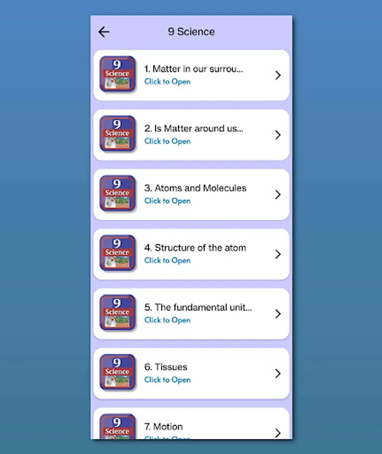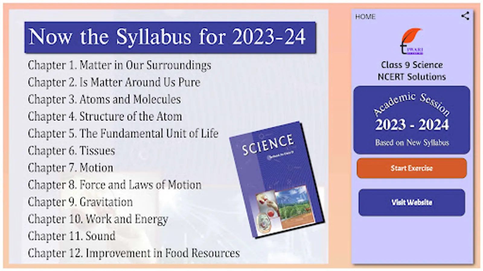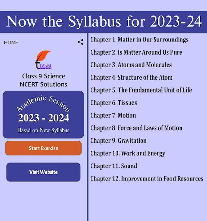 Note: Earlier there were 15 chapters in class 9 science course, but as per the new NCERT books issued for academic year 2023-24, there are only 12 chapters in curriculum. Rest three chapters are deleted from the syllabus. This app contains only that chapters which are in syllabus for 2023-24. For any inconvenience, please contact us for help.