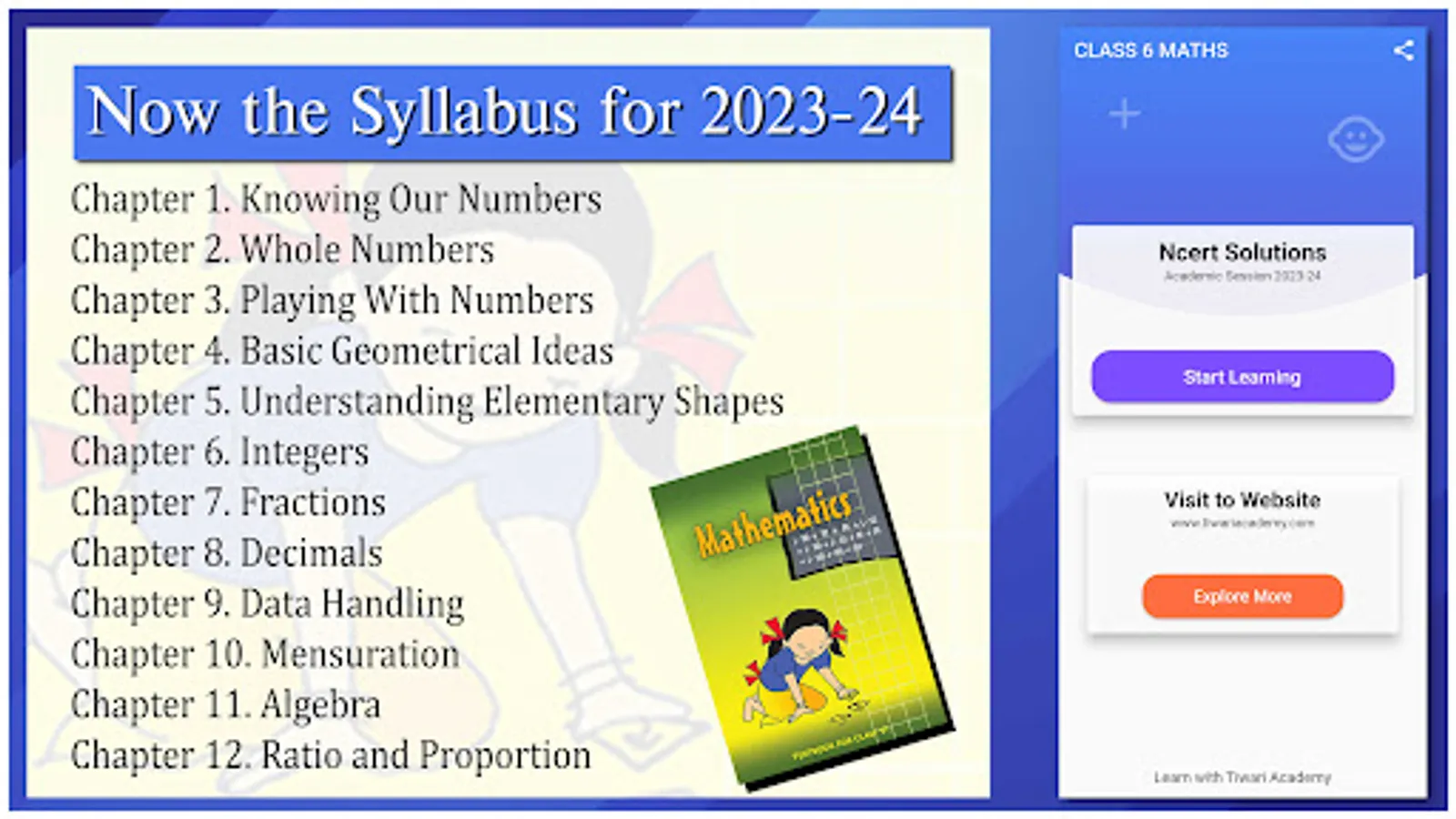 This mobile app is intended for help of teachers, parents and the students in CBSE education following the new textbooks issued for academic session 2023-24. Parents can guide kids using the PDF and videos of this app. The Solutions provided here are modified and revised as per new syllabus. These are simple to use and just a way how to solve the problems given in NCERT Textbooks. Other books may have different way of solutions and it may be not be same as given here. Consult the teacher or call us if any doubt in answers.