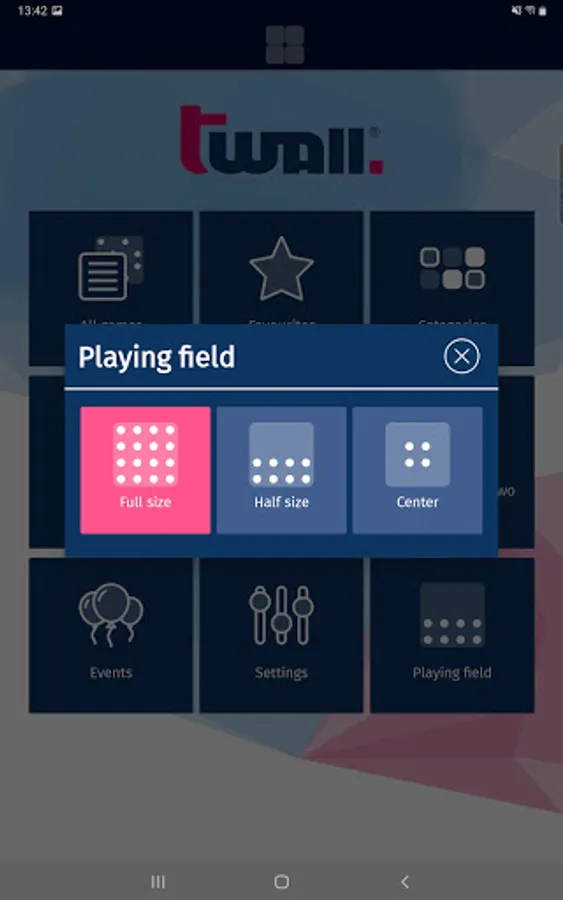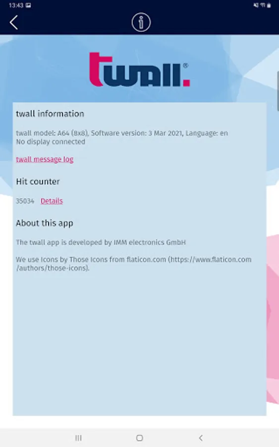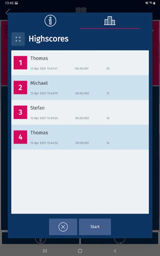With the app you have access to all the programs which are saved on the twall® PLUS or twall® advanced. It is very easy to handle the app. After starting a program, you get information about the current time, the hits and the misses. Once you reach a high score you can enter your name. The high score of each program are saved in a separate high score list. In addition to program and high score list you can display diverse information about the plugged devices.