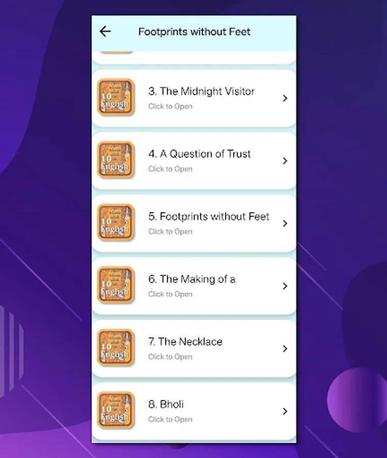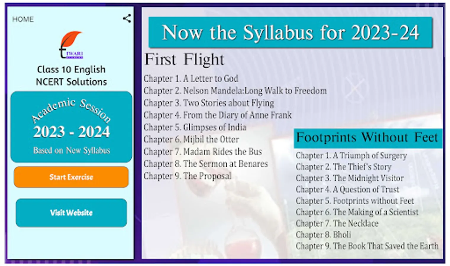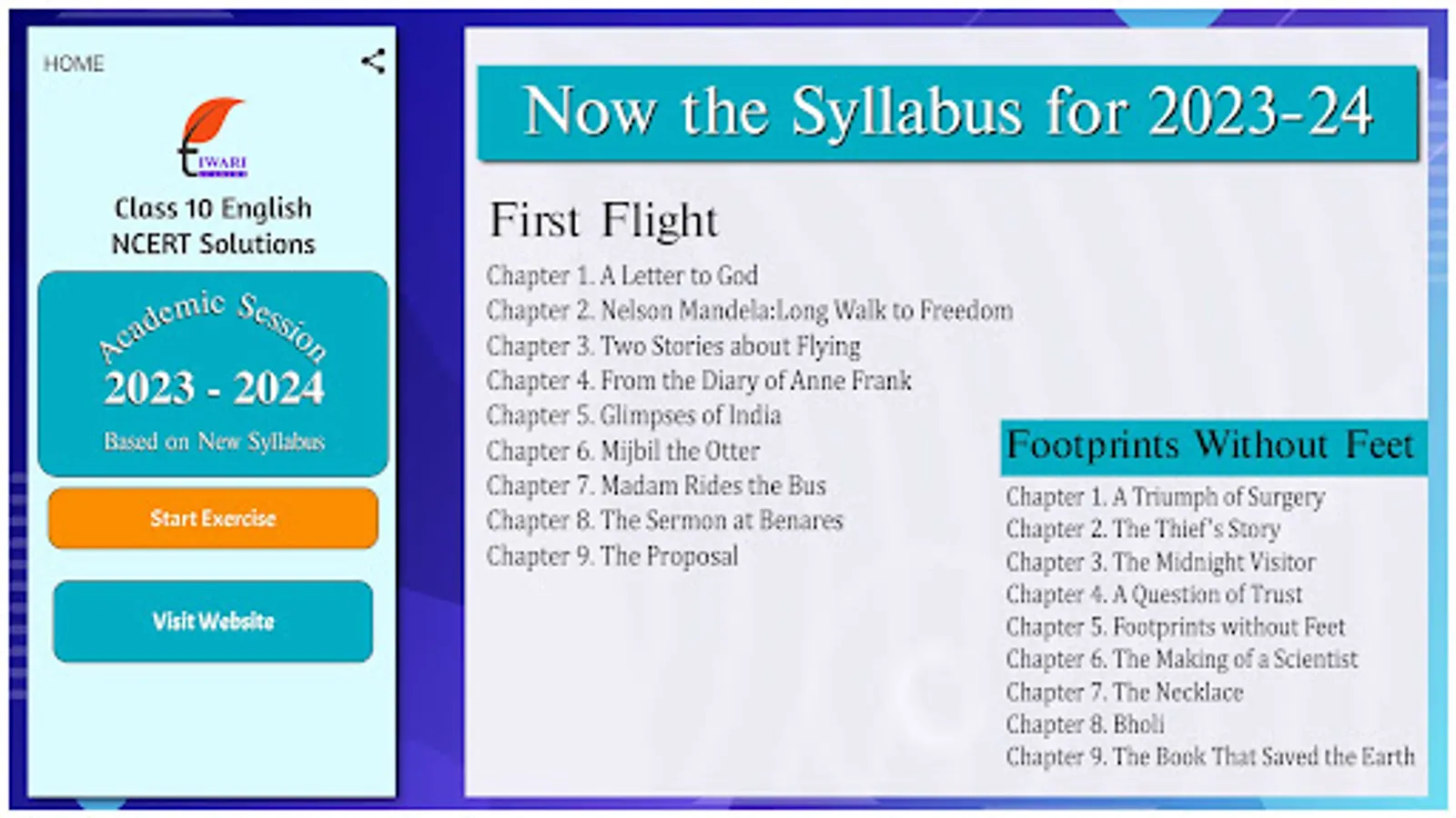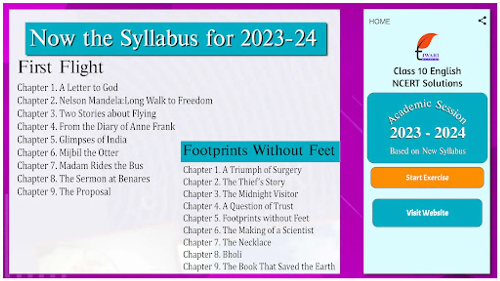 This Class 10 English NCERT Solutions is revised and modified according to rationalised NCERT books published for academic session 2023-24. The 10th English Question Answers App is covering the books First Flight and Footprints without Feet based on current CBSE Syllabus. It contains the following chapters: