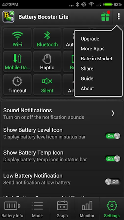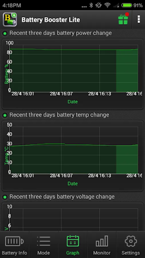 Three graphs are given in Battery Booster to track the recent three days battery information, including battery level, temp, and voltage. You can use these statistics to analyze and find out the most effective battery saving mode for yourself.