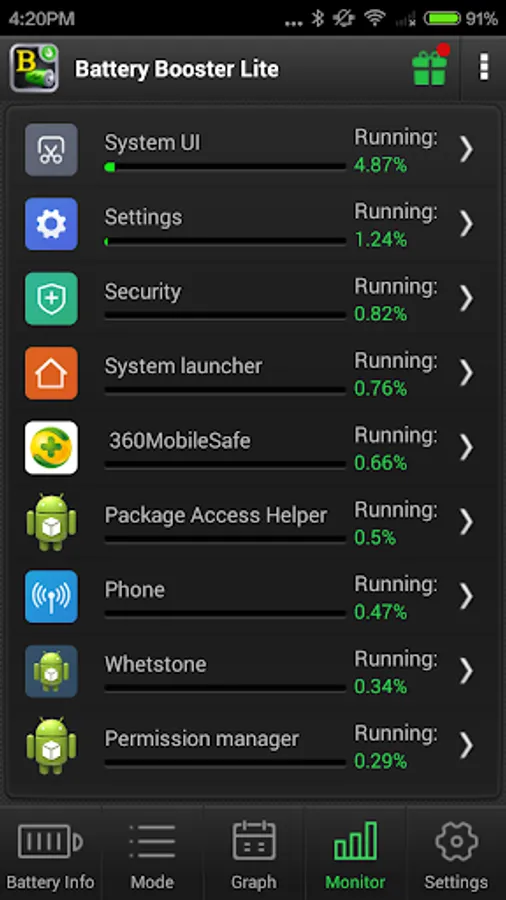 Battery Booster keeps an eye on all running processes, and shows you the battery consumption ratio of each process. With this information, you will easily find out the battery-draining processes, stop or uninstall them to enhance battery life.