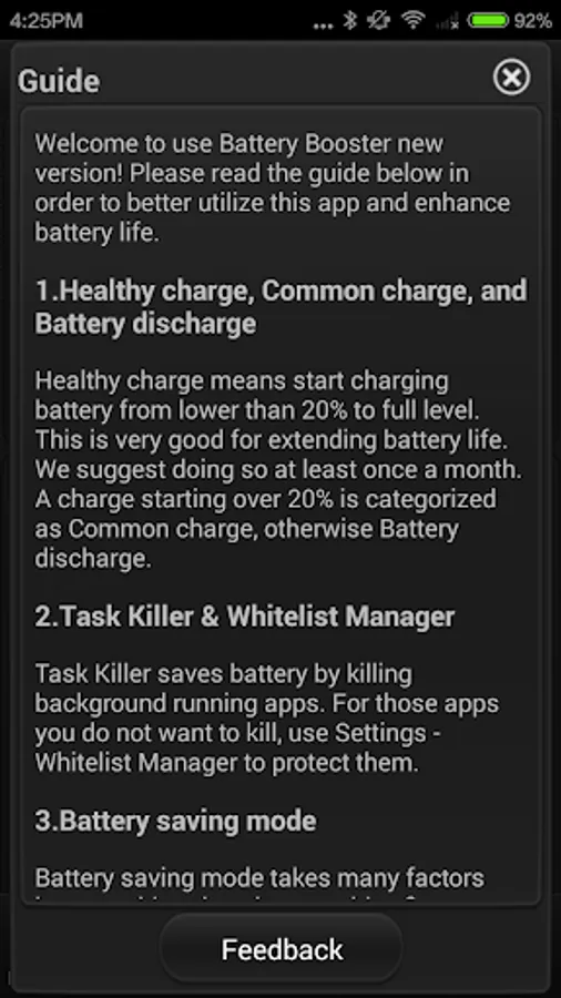 Battery Booster saves battery by killing running background processes. For apps that you do not want to kill, you can use Whitelist Manager to protect. Furthermore, with the advanced task manager (Memory Booster - Android RAM Optimizer), Battery Booster can perform better and help you get the best battery saving results!