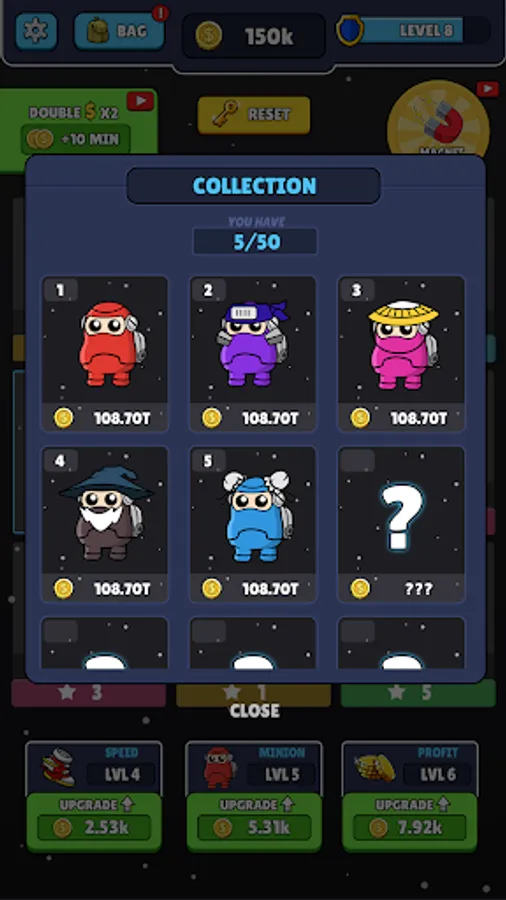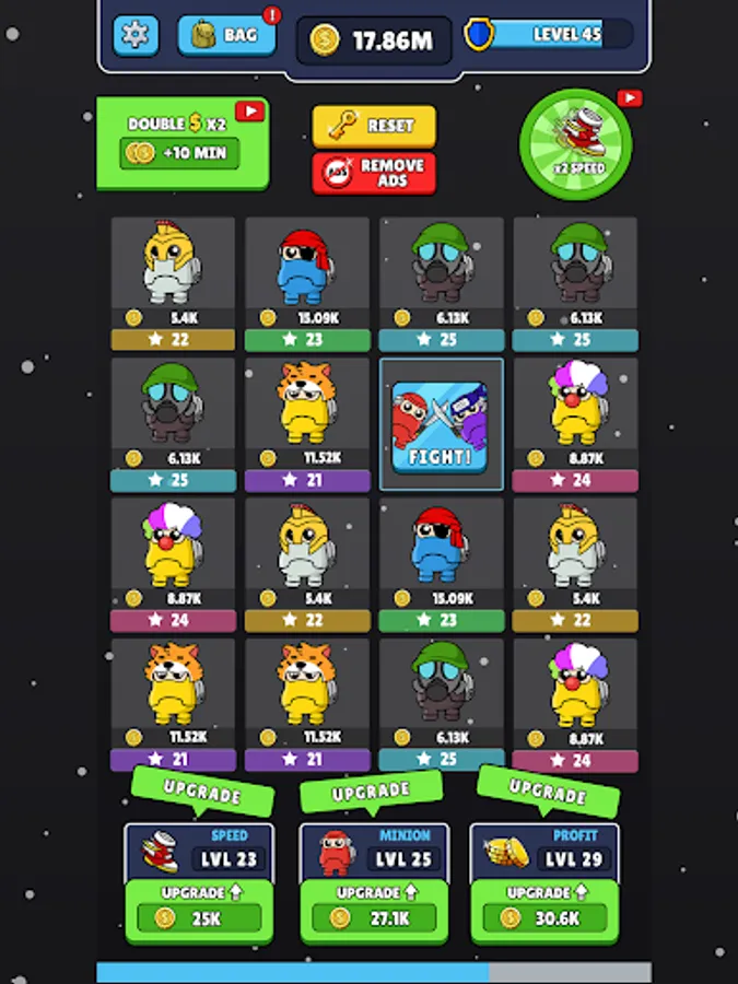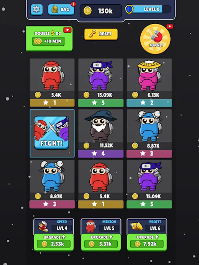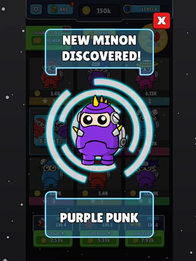 Merge imposters to earn XP, coins, and level up! The higher your level is, the faster you detect a new imposter evolution. Want to play 2X faster? Start from the beginning by kicking all the traitors from the spaceship!