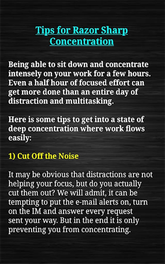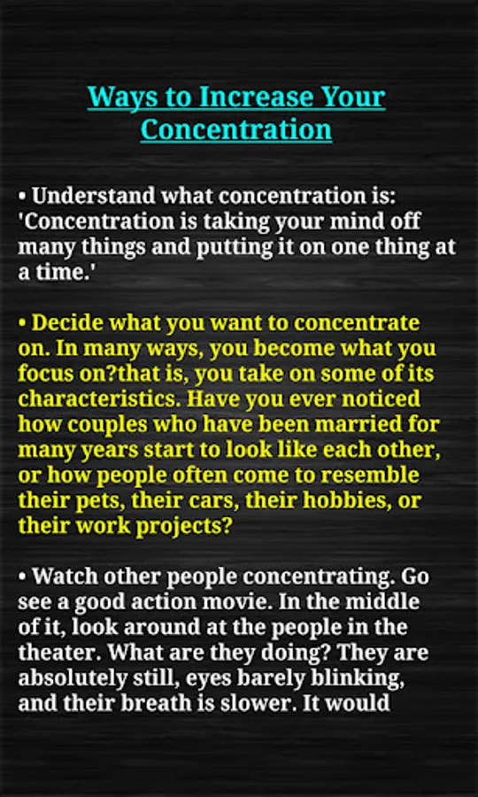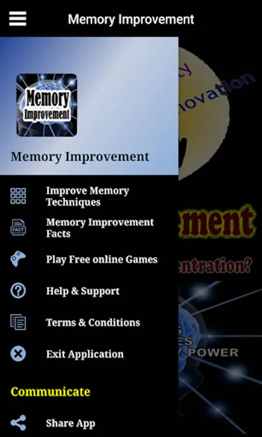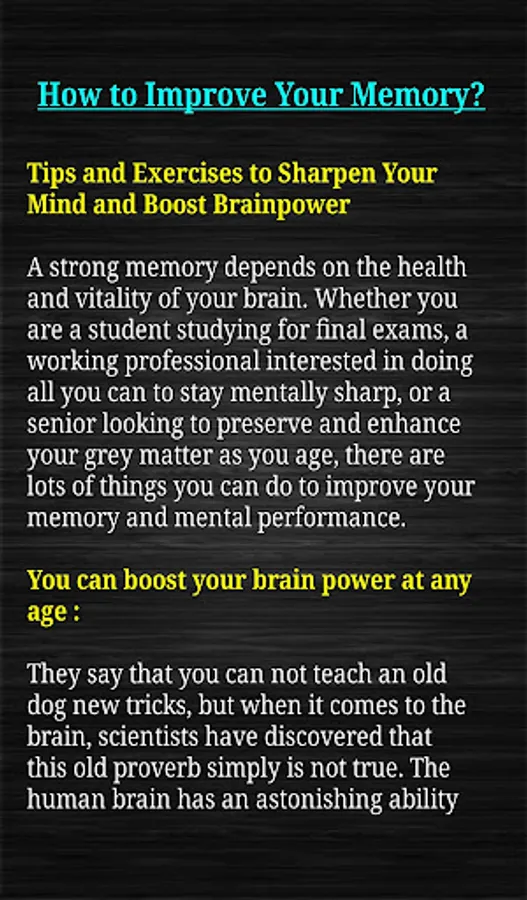 Have you ever imagined how life would be without long-term memory? Not remembering your phone number, your friend's name, where you live, or what to say in speech class can be quite embarrassing, not to mention a little bit scary. The truth, however, is that memory loss can happen to anyone and at any point in life. There was a time when memory loss was often linked to aging but things have changed. Nowadays, due to the combination of busy schedules, workplace stress, unhealthy diets, excessive smoking, and large consumption of alcohol, memory loss is now a common problem. Memory improvement is the act of improving one's memory. Memory improvement can be achieved in two ways: 1) by improving the health of your brain, and 2) using memory skills. These are easier to do than you might think, but you have to make the effort. A powerful memory can help you succeed in school, in your job, and in life. It helps you learn faster, and fast learners are always in demand. And they make more money. Trust us...This app will provide you awesome tips and easiest tricks to boost your memory power, to sharp your memory power day by day, which will help you in every footstep of your life. Seriously....Grab it and check....