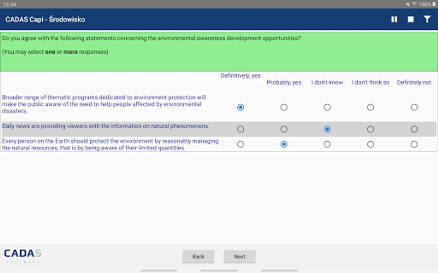 CADAS Mobi user (Respondent or Interviewer - depending on given data collection method) can run and complete in off line mode any questionnaire / form created with the standard CADAS questionnaire editor using the Android driven mobile devices like: tablets, tablet PCs smartphones and handhelds.
