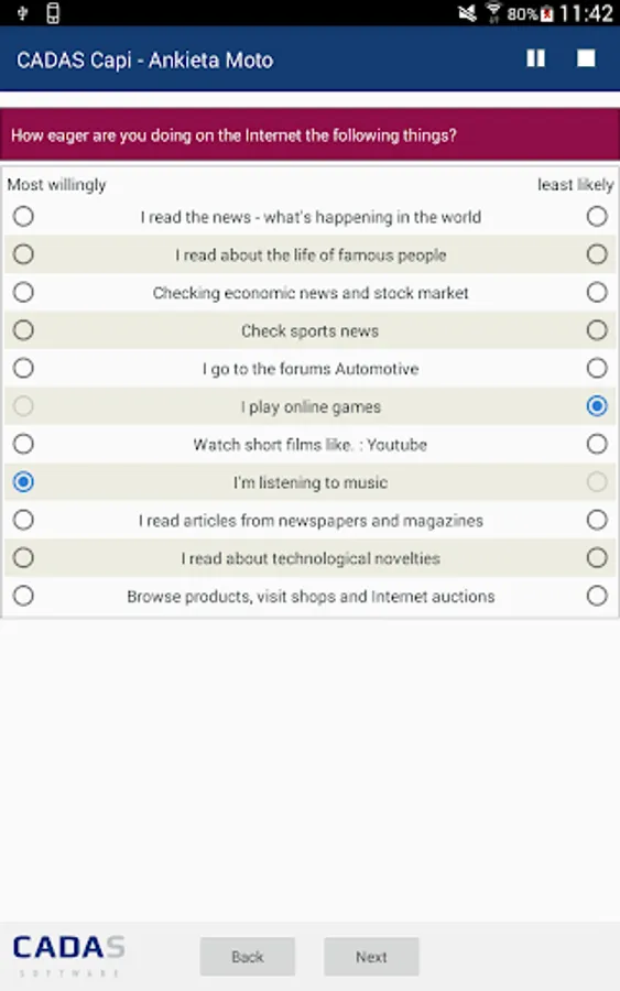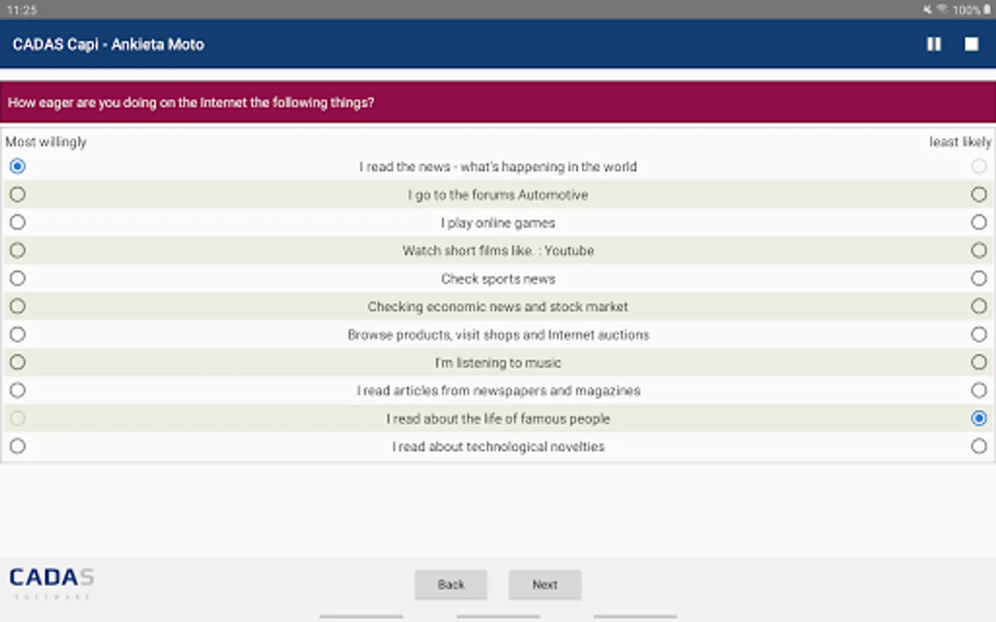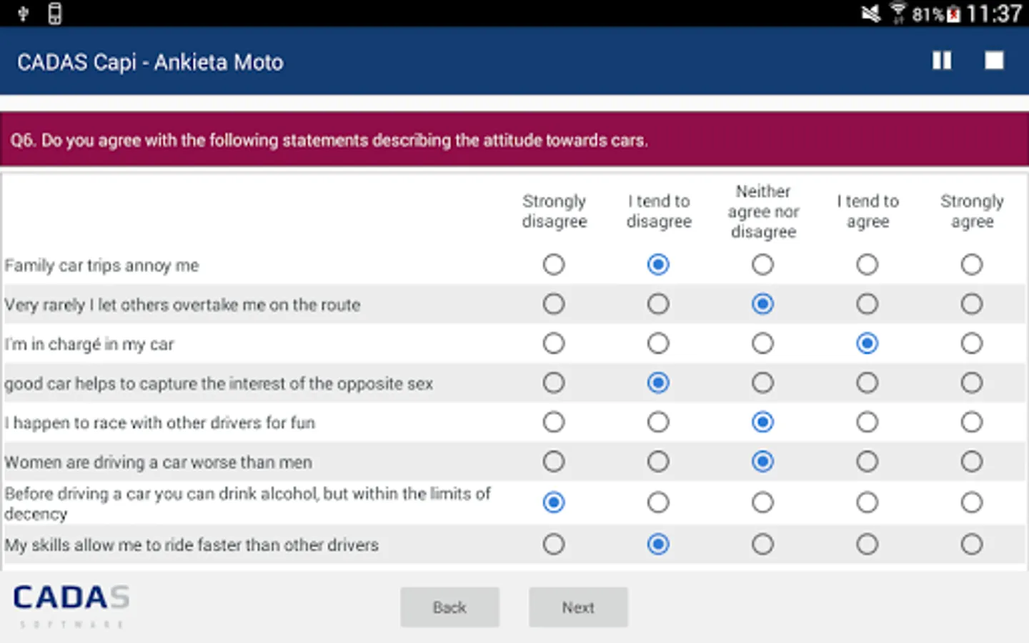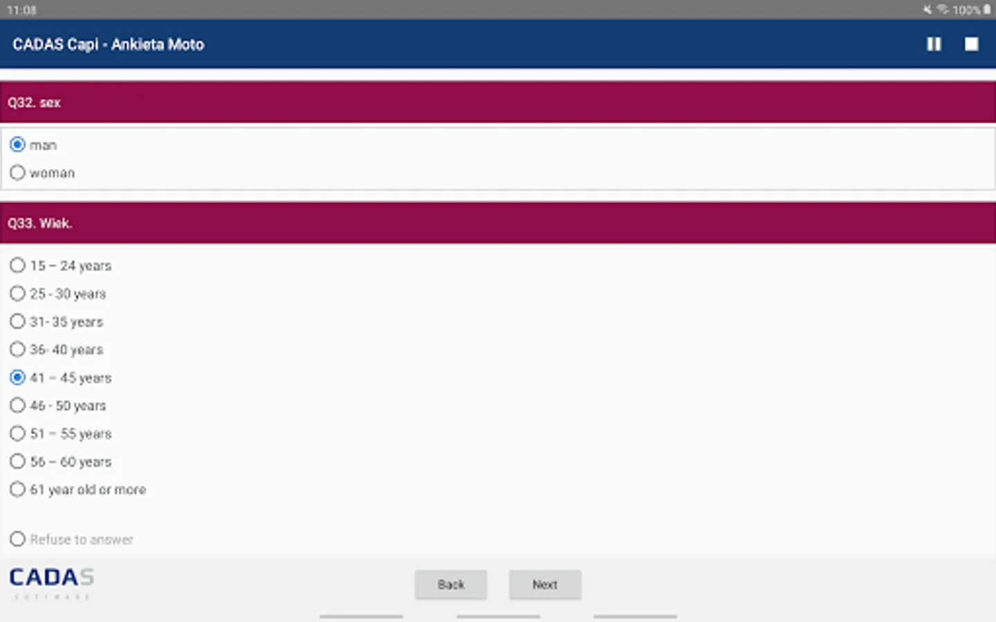 CADAS Mobi user (Respondent or Interviewer - depending on given data collection method) can run and complete in off line mode any questionnaire / form created with the standard CADAS questionnaire editor using the Android driven mobile devices like: tablets, tablet PCs smartphones and handhelds.