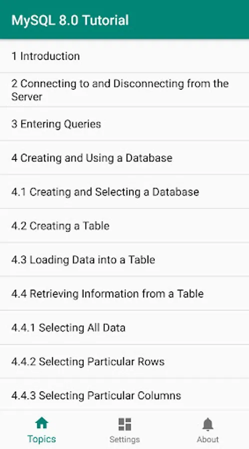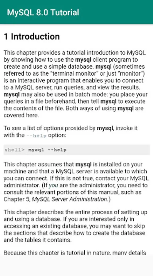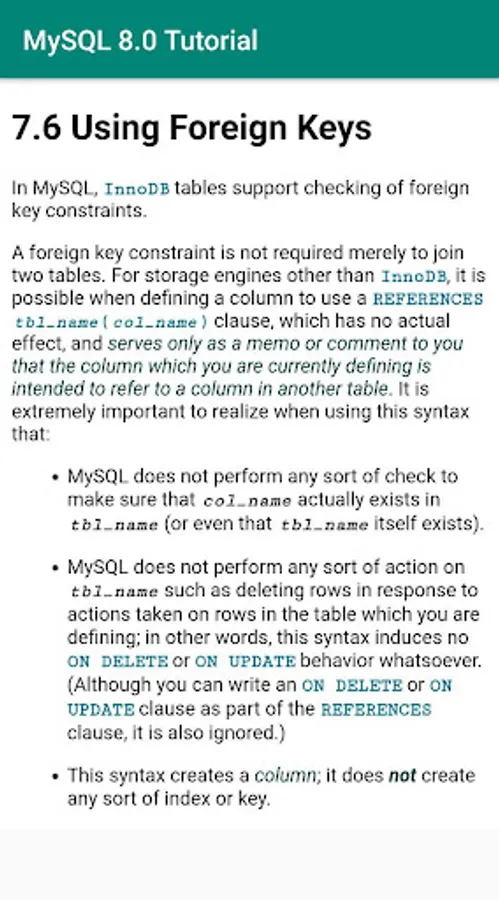 This is a free, offline MySQL 8.0 tutorial app sourced from its official documentation.