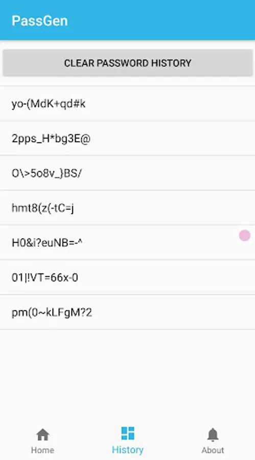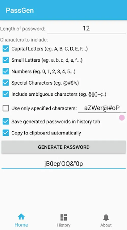 Different combination ensures you get a completely random, complex string of characters for your password built on specified set of characters. It allows you to specify your own custom character set for password generation. Generated passwords can be copied to clipboard. Also if kept enabled, every generated password is kept in "History" tab for quick reference.