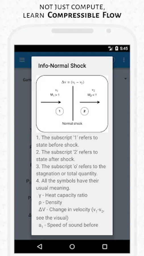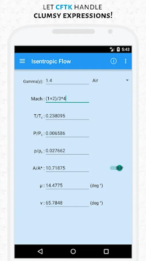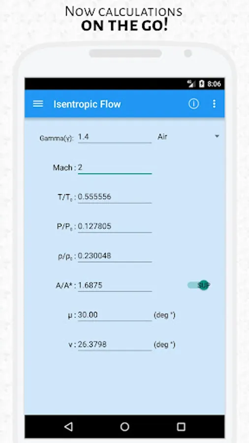 It includes Isentropic flow, Normal and Oblique shocks, Fanno and Rayleigh flow. A toggle switch provided allows users to switch between supersonic and subsonic flow regimes in no time! Tapping the info button provides you with information regarding the proper usage of the toolkit along with explaining the flow conditions.