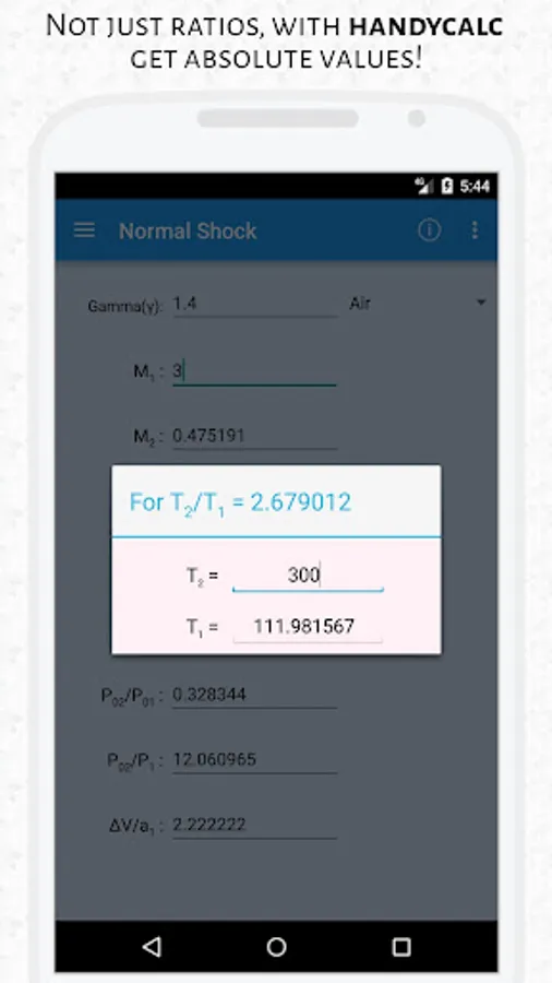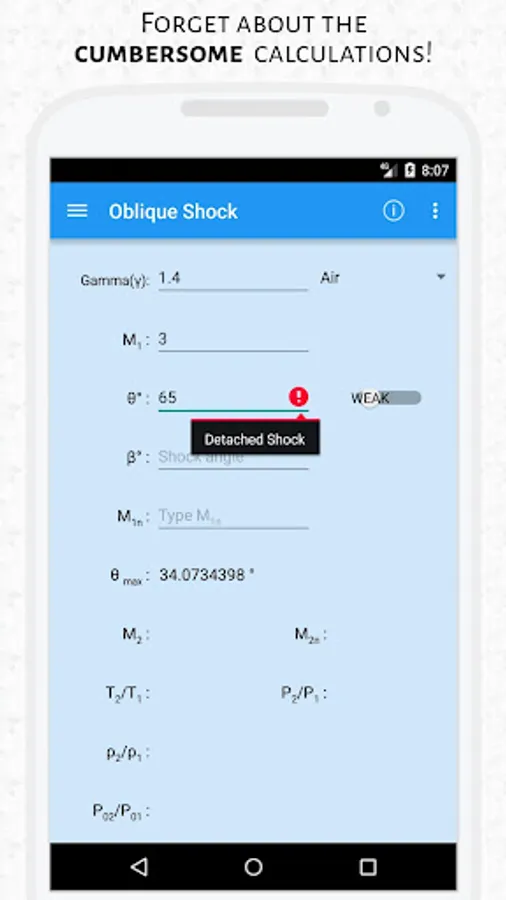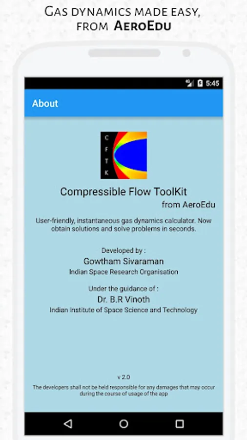 In this ever growing tech world, it becomes essential to utilize our resources to their maximum extent, and that is exactly what CFTK does. CFTK is developed to take the maximum advantage of your android's capabilities to provide solutions to engineering problems in mere seconds. The purpose of this app is to provide a user-friendly instantaneous gas dynamics calculator which will serve as a tool for understanding and also as a teaching aid.