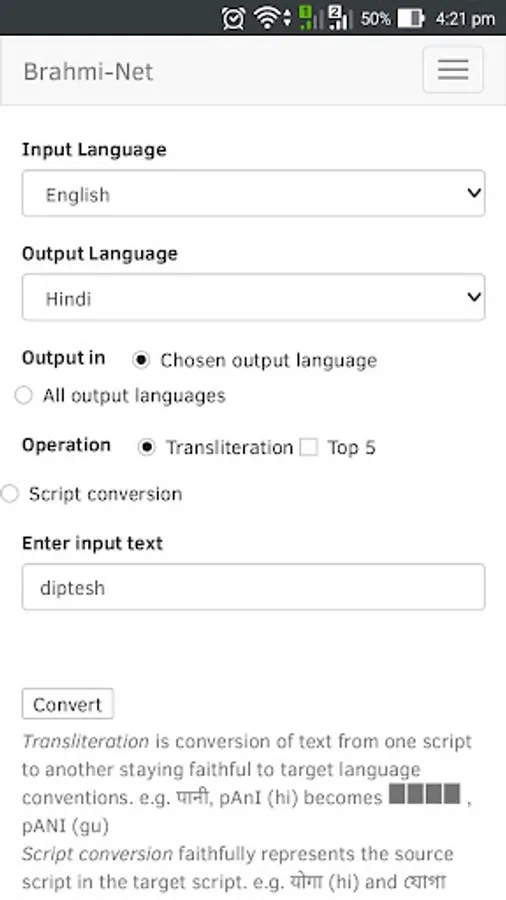 Brahmi-Net is an online system for transliteration and script conversion for all major Indian language pairs (306 pairs). The system covers 13 Indo-Aryan languages, 4 Dravidian languages and English.