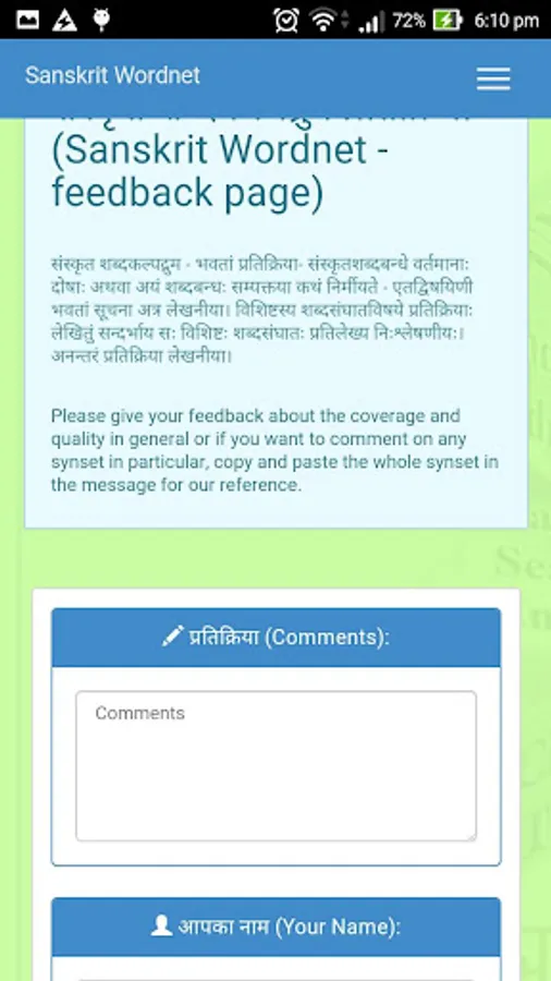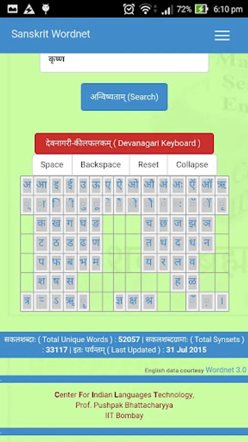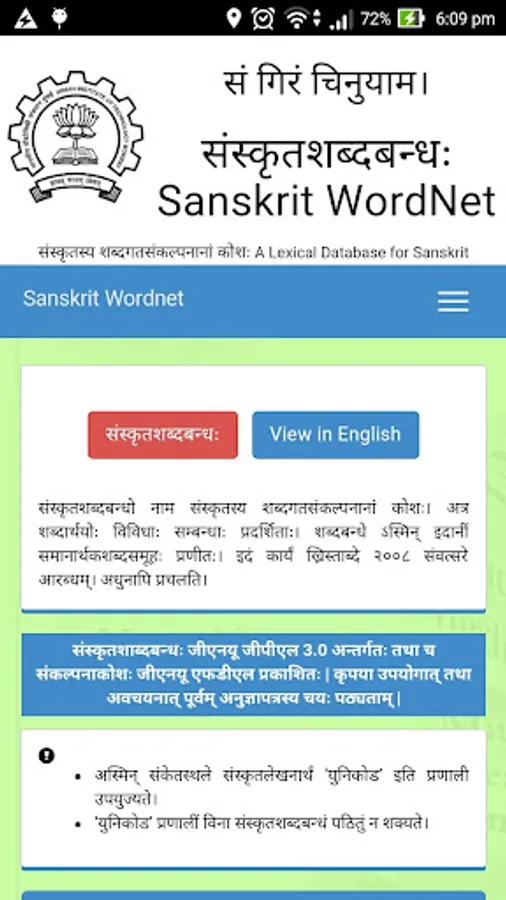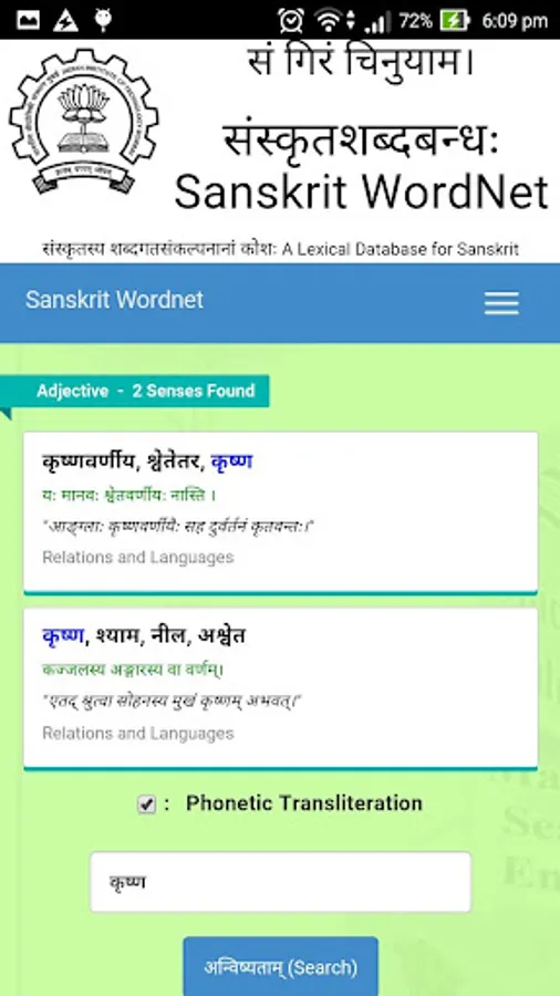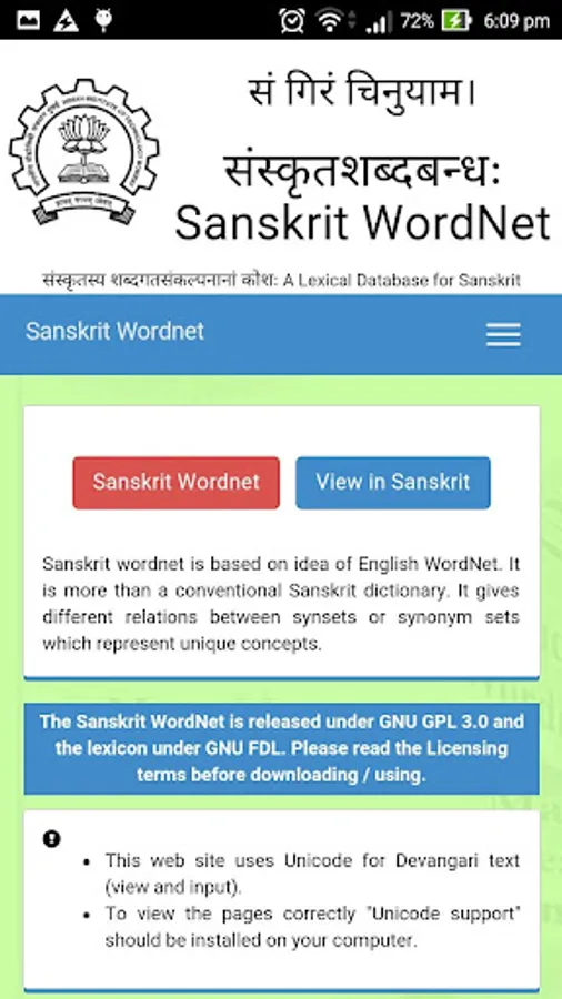 Sanskrit WordNet provides you free access to more than one lakh words in its lexical database. The dictionary like structure is multilingual, and translations to respective other languages and English are also available.