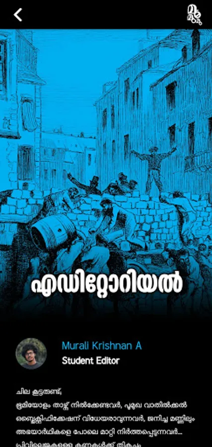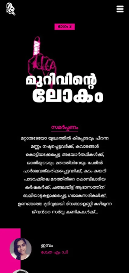 Moo Mu Mu: Moodikettiya vaayukal, Murivinte lokam, Muzhangunna mudravakyangal put across the three steps to freedom. The magazine redefines the complex idea of freedom and imparts that it can be achieved only when we accept complete responsibility for ourselves and the connection between what we do, who we become, and what we get. Moo Mu Mu silently reminds “None are more hopelessly enslaved than those who falsely believe they are free”.