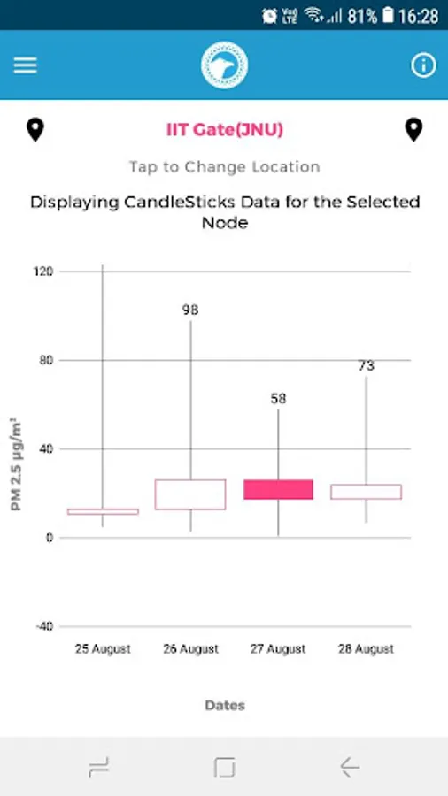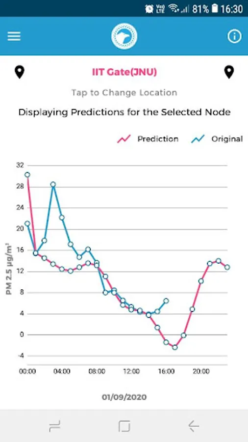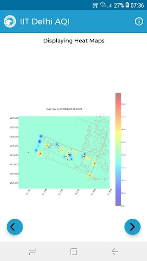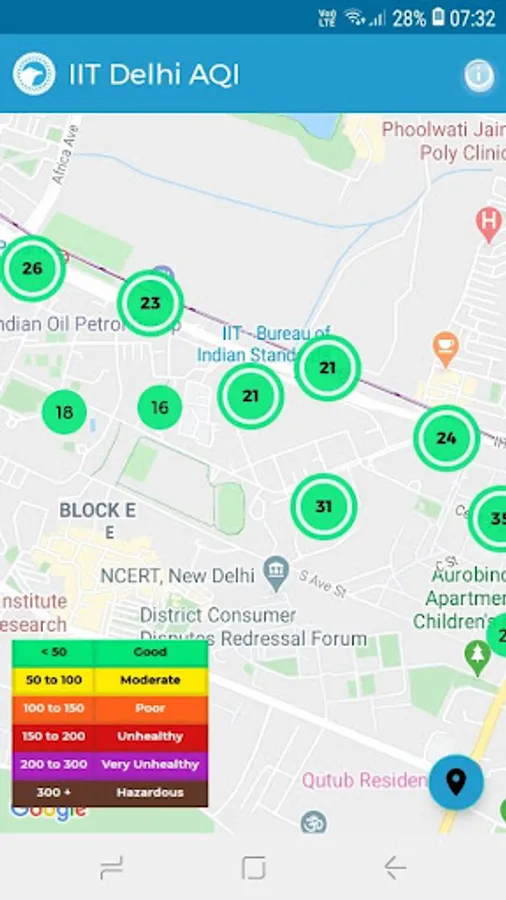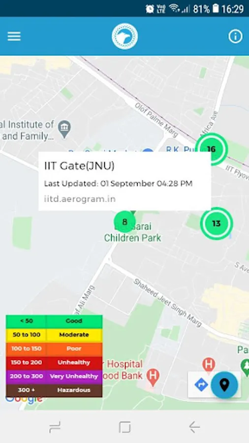 IIT Delhi AQ is an Air Quality Monitoring App that displays the value of PM 2.5 levels around the Indian Institute of Technology Delhi.