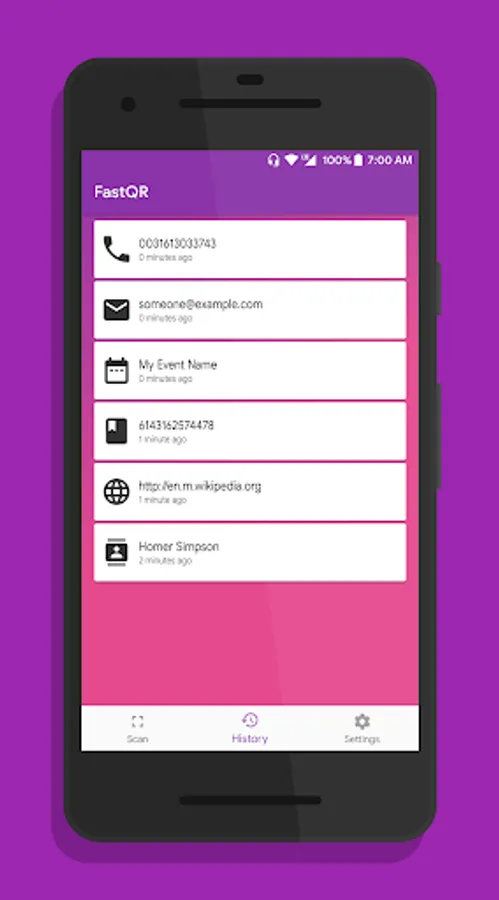 FastQR can detect and save multiple types of QR and Barcodes. You can simply save this information in respective apps. For example, Contact barcode will create a new contact for you. Some of them are -