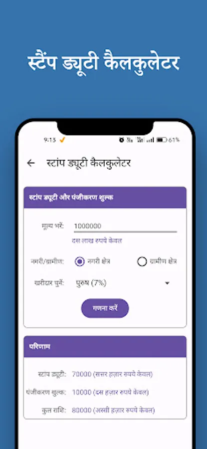 Our stamp duty calculator makes it easy to calculate the stamp duty you'll need to pay when you register your land records. With just a few taps, you can quickly and accurately determine the stamp duty based on the value of your property.
