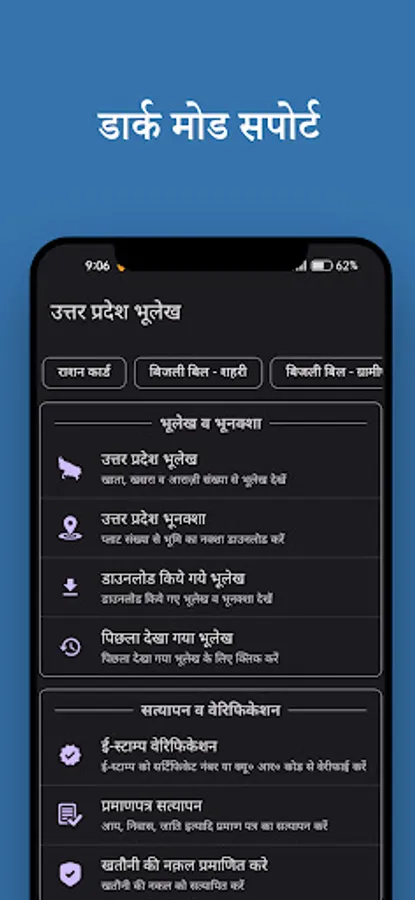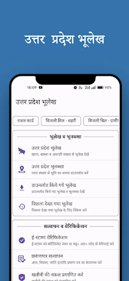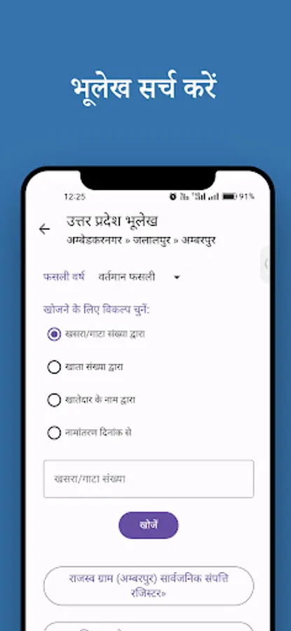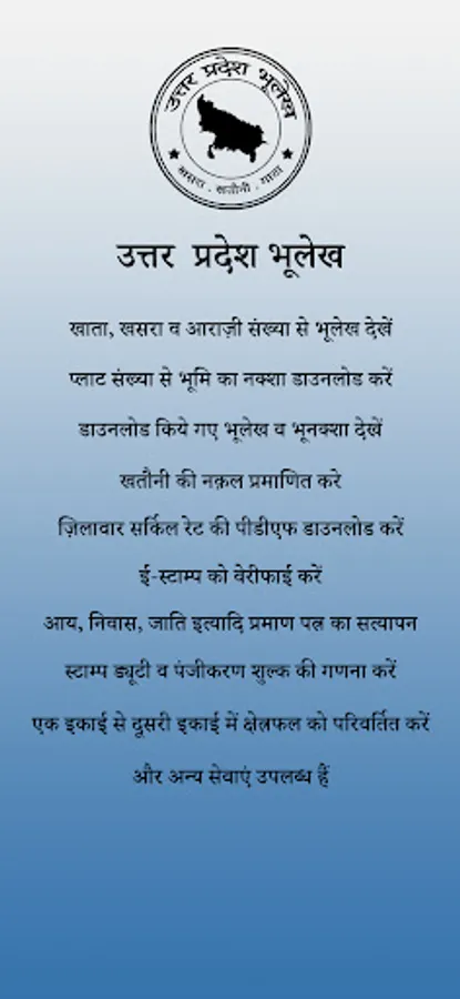 UP Bhulekh (भूलेख) App is an Android App designed to help people in Uttar Pradesh view and download their digital land records (भूलेख) easily. With this app, users can retrieve their land records with just a few clicks, using parameters like Khasra/Gata Number (खसरा या गाटा संख्या), Khata numbers (खाता संख्या), Name of owner (खातेदार का नाम), and registry date (नामान्तरण दिनांक). This app provides a user-friendly interface and provides land records (भूलेख) in easy steps.
