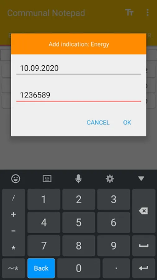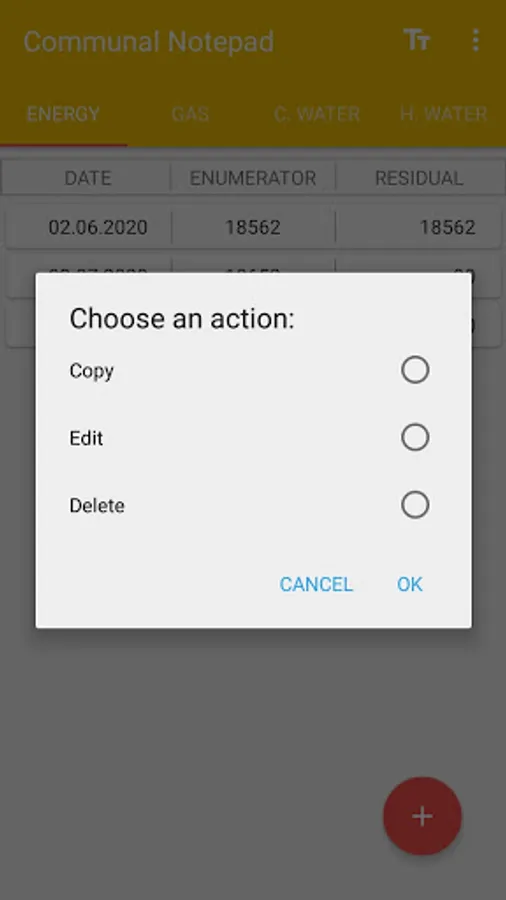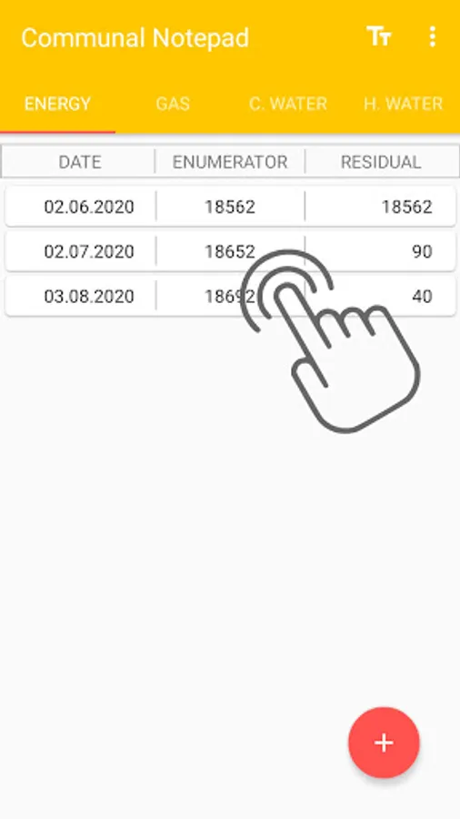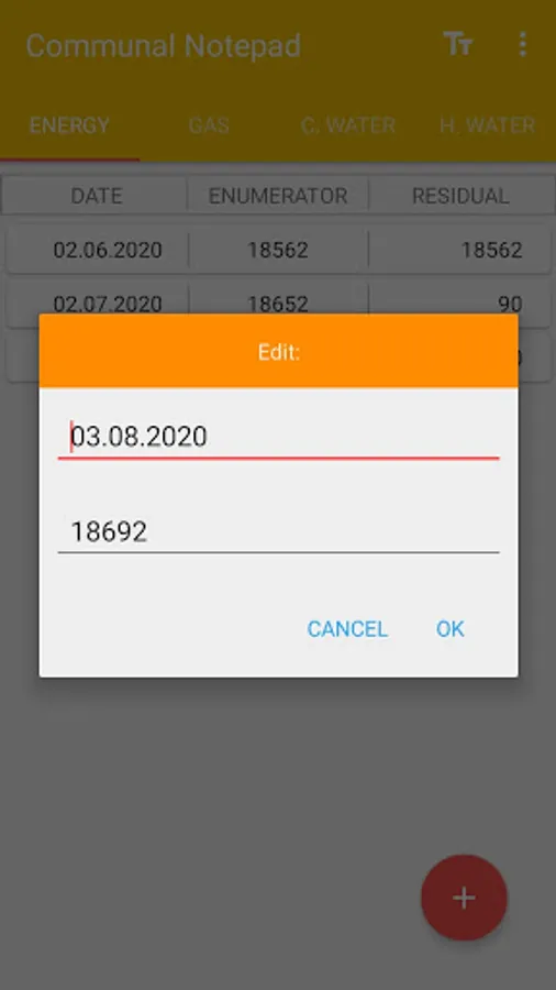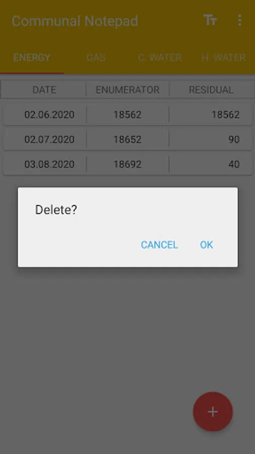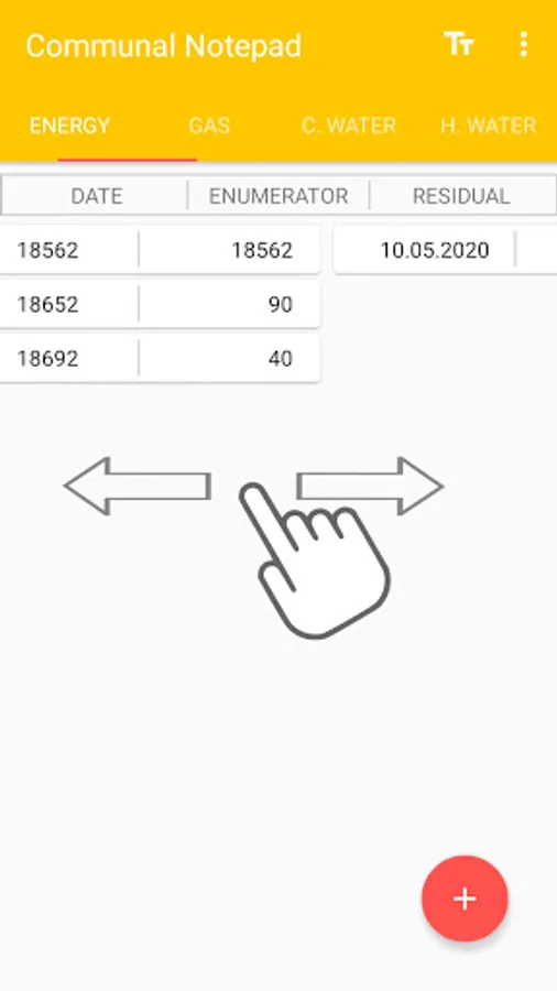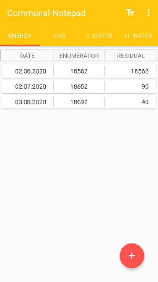 A simple notepad for utility meters. Three filled fields: date, meter reading, difference with the previous reading.