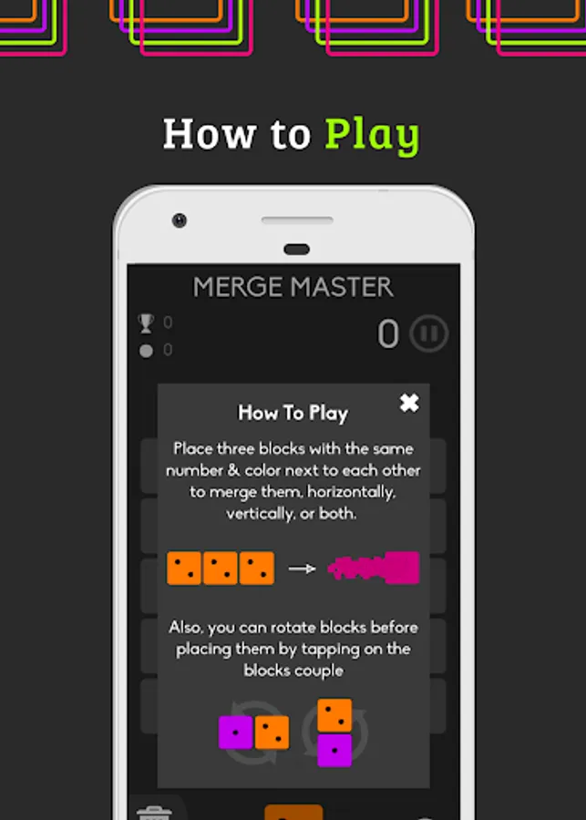 Match 3 of the same colored dice, merge your blocks together and play for hours with addicting logic puzzles in Merge Master.