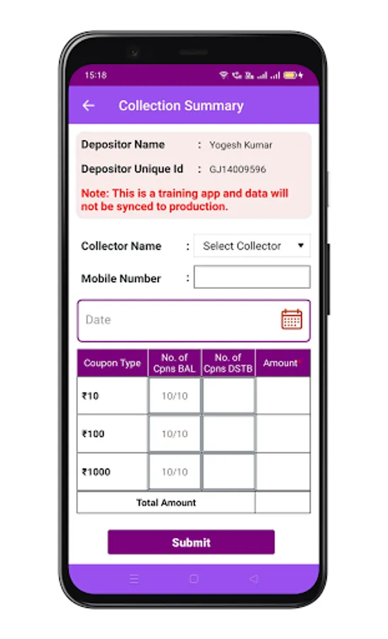 It has the features coupons serial number update, Collector creation, cash collection thru Coupons, Cash collection thru Receipts, Cheque collections features. It also has sync with server side as it works offline mode as well. All depositors who are defined and approved in Web application, can login into this application by downloading APK from Playstore.