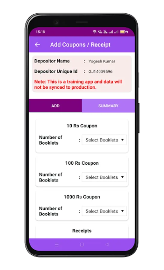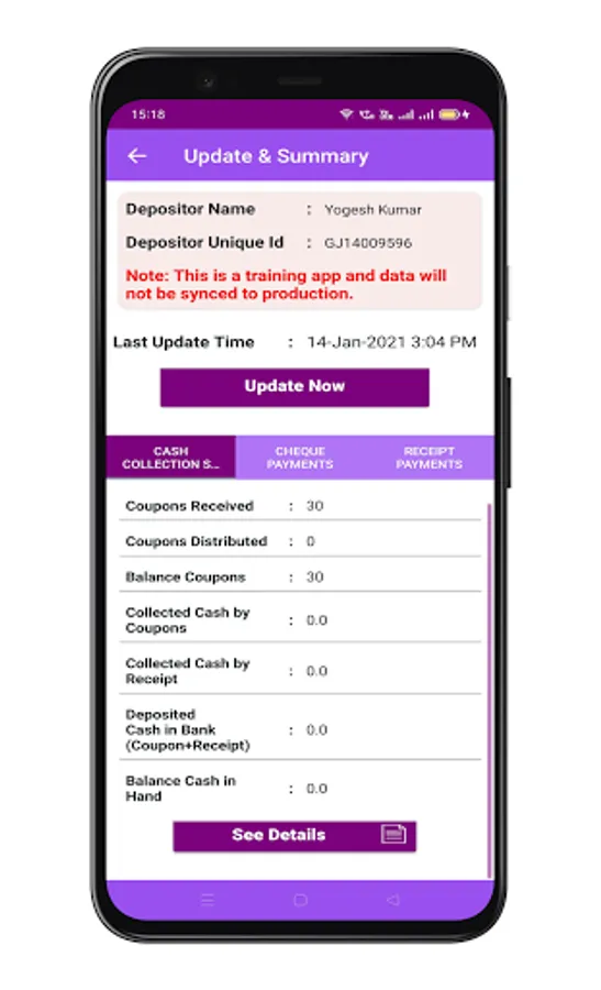 This APK is only used for Training purpose. Any data entered by Depositor will not reflect into bank deposit reconciliation. This APK is can be used by all Pranth & Jilla's for the purpose of training all Depositors and ensure they keep this APK exclusively for Training purpose only.