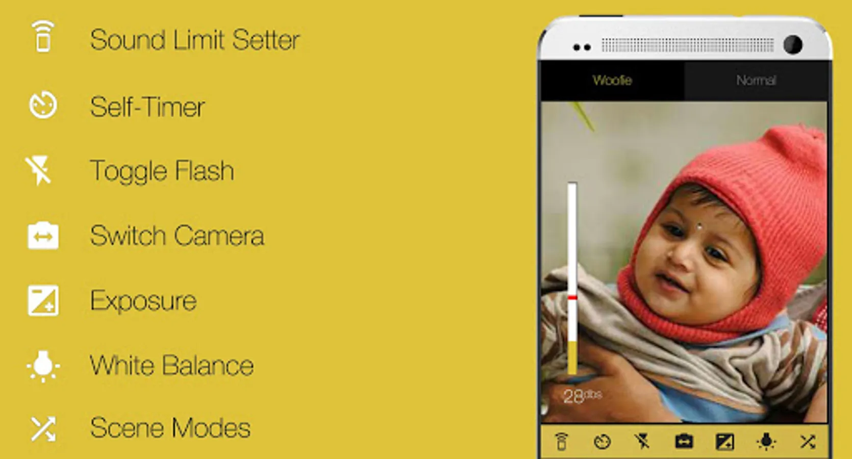 Woofie Camera Mode: Capture photos listening to sound at customized user set limit.