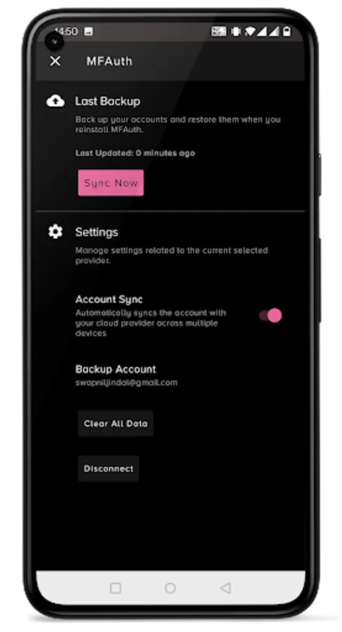 Never lose your codes again! With Cloud Sync, you can easily backup your 2FA accounts to your own Google Drive or the MFAuth cloud server. Using the Cloud sync feature, you can easily restore recently changed data with ease.