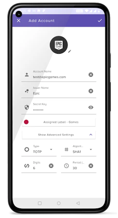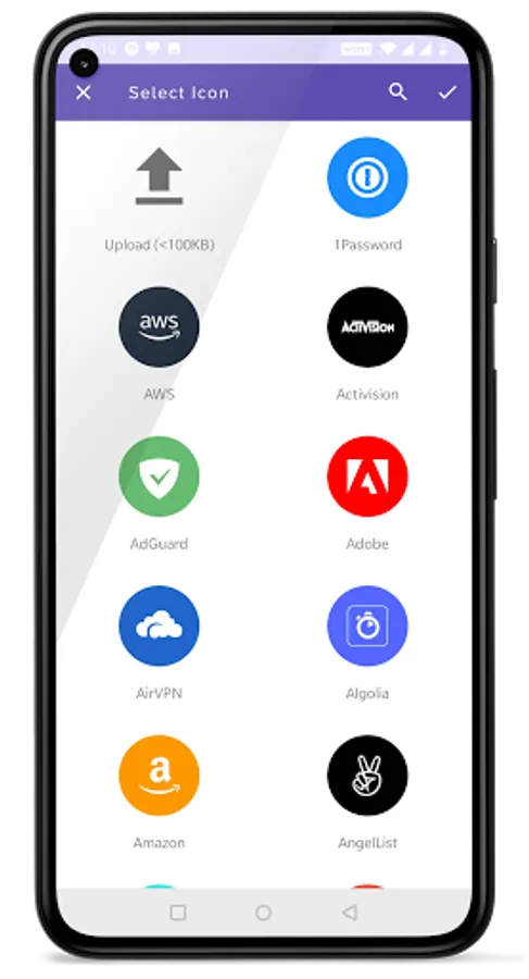 The app allows you to set unique icons to your accounts, either by selecting icons from the provided list or by uploading them. This helps you to easily recognize and sort your accounts. You can also choose from 2 different modes of design to show your accounts.