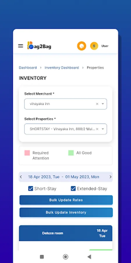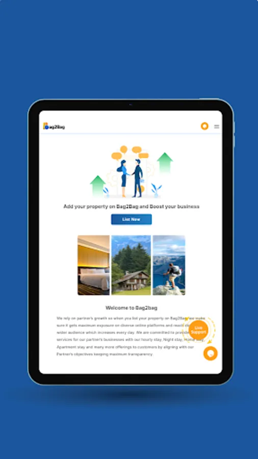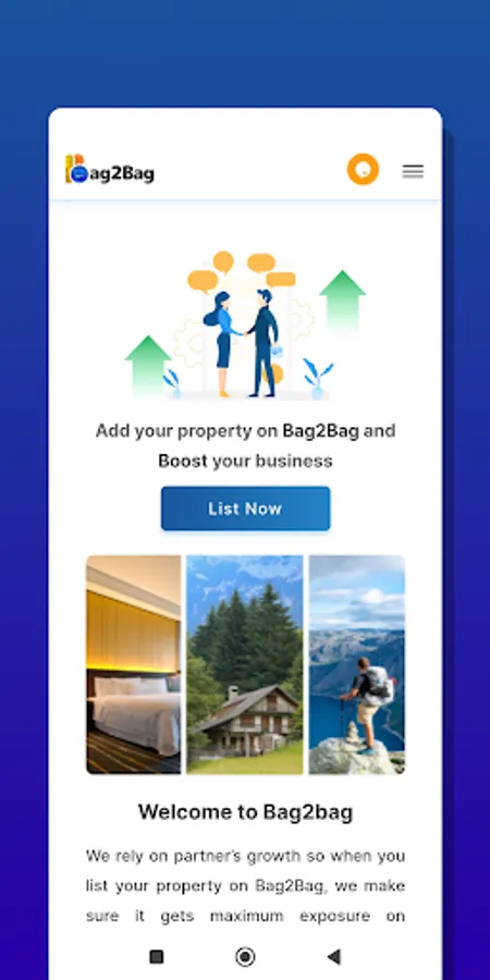 Bag2Bag is India's most awaited innovation in online Hotel booking and Hospitality. It is an online accommodation booking platform that allows to book Hotels by hour and Hotels + alternative accommodations (hotels, homestays, service apartments, resorts, cottages, villas, and more) on daily, weekly or monthly basis along with online booking of food and beverages and more.