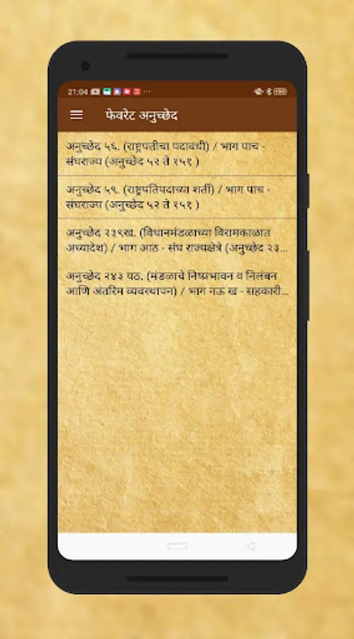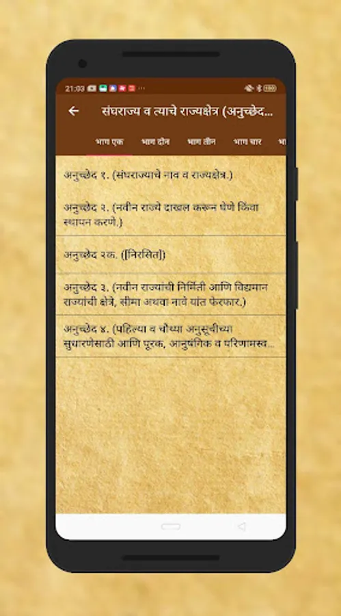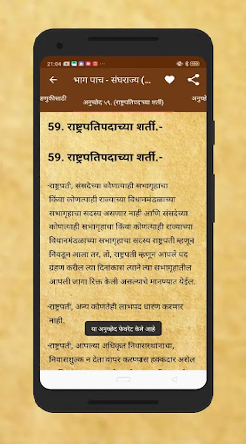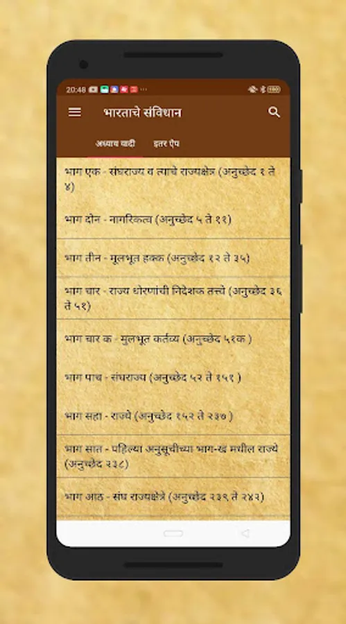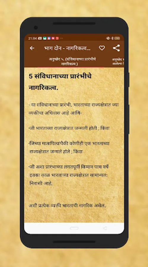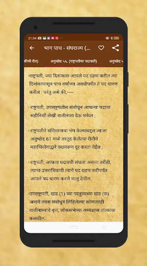 Read the entire Constitution of India in Marathi including all the articles, schedules, and amendments as notified by Government of India in a very easy to use user-interface. The Constitution of India app presents a simplified version of our Constitution to the aspiring civil servants in our country. Constitution of India is neatly categorized into user-friendly categories. The COMPLETE Constitution of India in clean and minimal UI. Divided into Parts, Chapters, Sub-Sections and containing the full unedited text of all the Articles. Also Contains 100 Amendments (till date), 12 Schedules and all Central Parliamentary Acts (Net).Current Path is always displayed on the top.