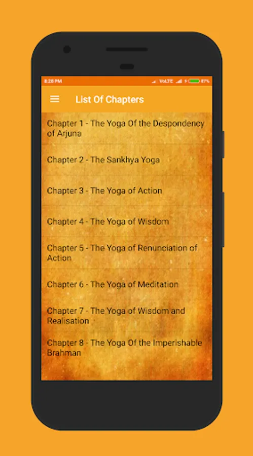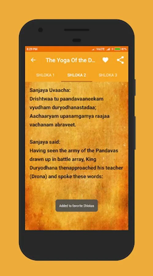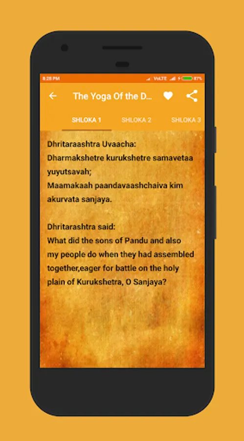 • Share feature to easily send your favorite Bhagavad Gita shloka / verse to your friends