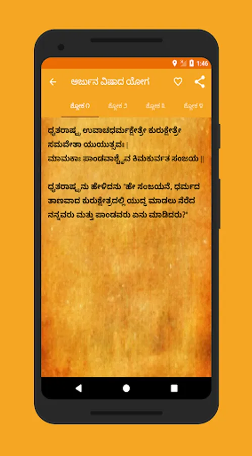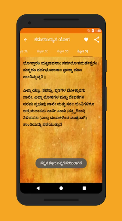 • Share feature to easily send your favorite Bhagavad Gita shloka / verse to your friends