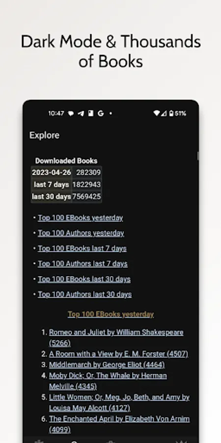 This app provides you with a large and fine collection of public domain Books and Novels in English for everyone with multiple categories and morals. The App is fully functional without the internet. The user interface is very fast and responsive and can be used equally well even in flight mode.