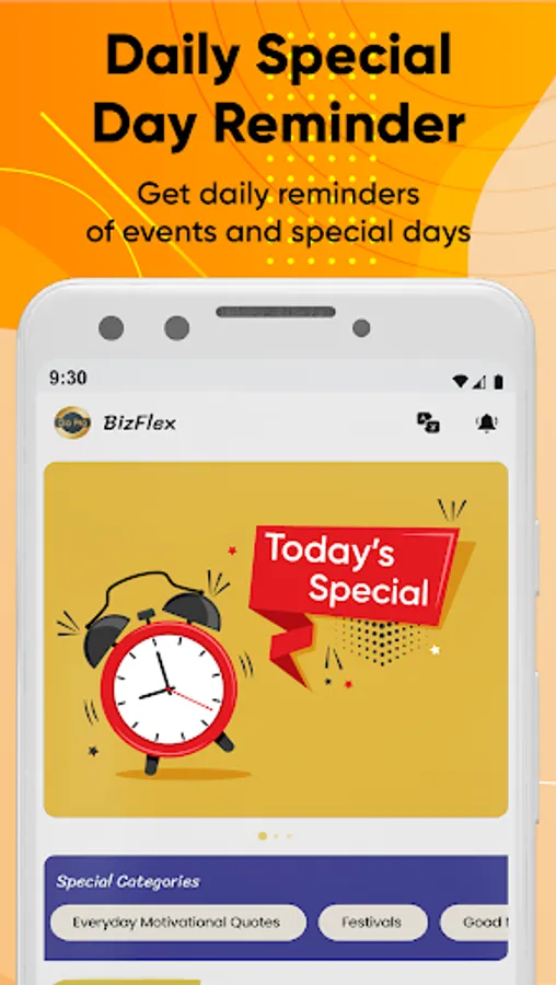 BizFlex has been developed to help every business, small or large, to grow its customer base and stay in touch with its customers through business marketing images and videos. Every day you get to explore different festival images that could be a key point to delight your customers. You can share social media posts on any occasion, whether it's an Indian festival or a Global Special Day.