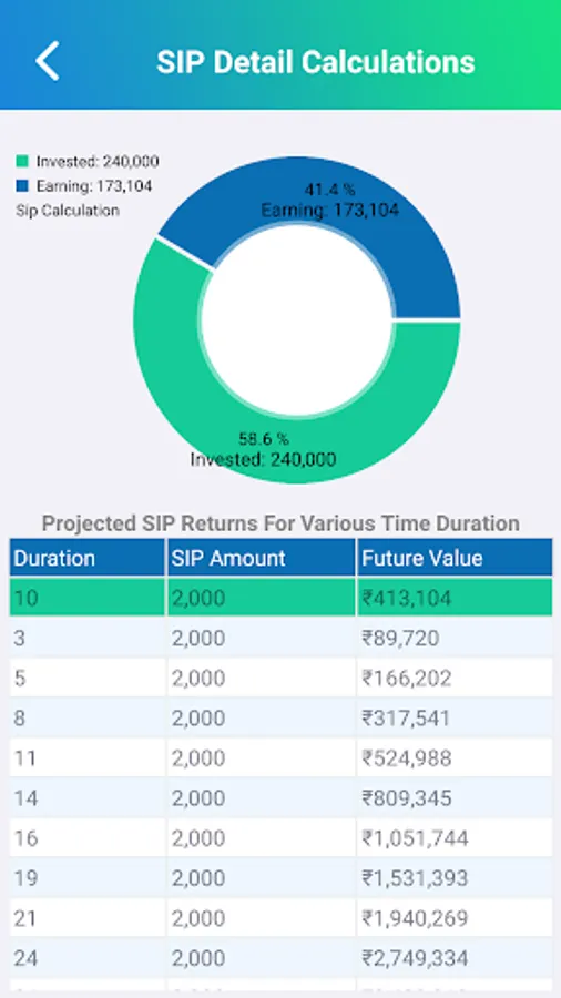 Tap on detail icon, It will show chart of invested amount vs earning amount and projected SIP return based on your mutual fund investment amount for various duration.