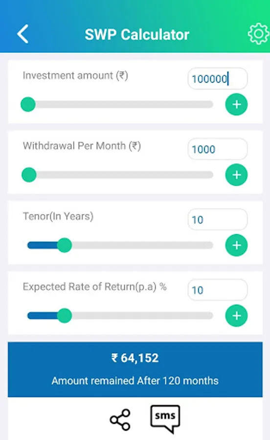 SIP Calculator app has SWP CALCULATOR feature where you can calculate how much SWP(Systematic withdrawal plan) you should make on your investment. In SWP CALCULATOR, provide investment amount, Tenor of withdrawal, Expected rate of return, SWP amount and it will automatically calculates remaining amount.