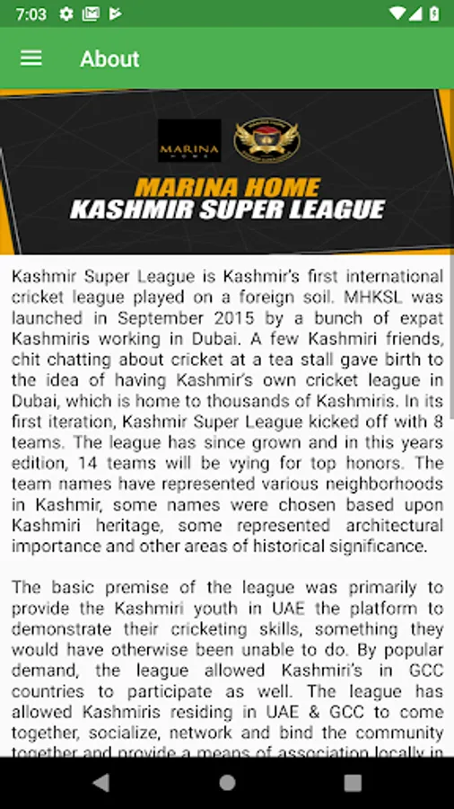 The basic premise of the league was primarily to provide the Kashmiri youth in UAE the platform to demonstrate their cricketing skills, something they would have otherwise been unable to do. By popular demand, the league allowed Kashmiri’s in GCC countries to participate as well. The league has allowed Kashmiris residing in UAE & GCC to come together, socialize, network and bind the community together and provide a means of association locally in UAE.
