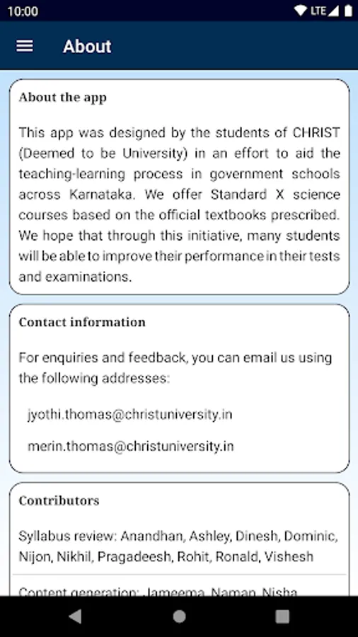 This app was designed by the students of CHRIST (Deemed to be University) in an effort to aid the teaching-learning process in government schools across Karnataka. We offer Standard X science courses based on the official textbooks prescribed. We hope that through this initiative, many students will be able to improve their performance in their tests and examinations.
