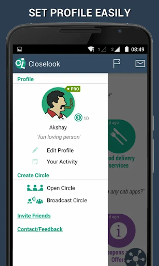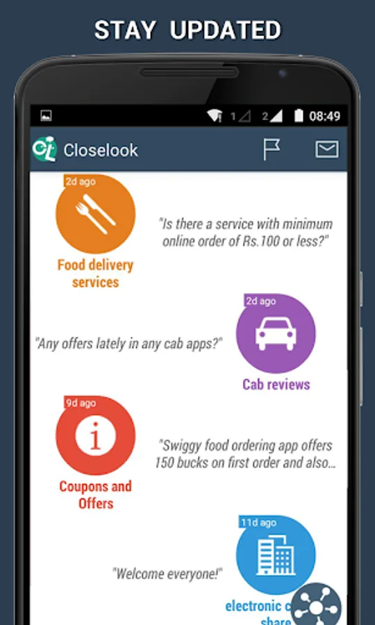 The Closelook app links you to all activities and happenings nearby. With its location based service, create or join a circle that interests you and find people sharing similar interests near your location. Follow and interact in the circles to stay updated on your favorite topics. Talk about the maintenance situation in your neighborhood, find best food in your locality, or discuss places to visit in a city.
