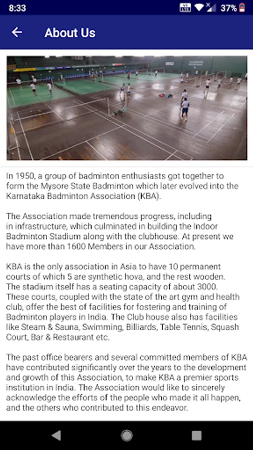 KBA is the only association in Asia to have 10 permanent courts of which 5 are synthetic hova, and the rest wooden. The stadium itself has a seating capacity of about 3000. These courts, coupled with the state of the art gym and health club, offer the best of facilities for fostering and training of Badminton players in India. The Club house also has facilities like Steam & Sauna, Swimming, Billiards, Table Tennis, Squash Court, Bar & Restaurant etc.