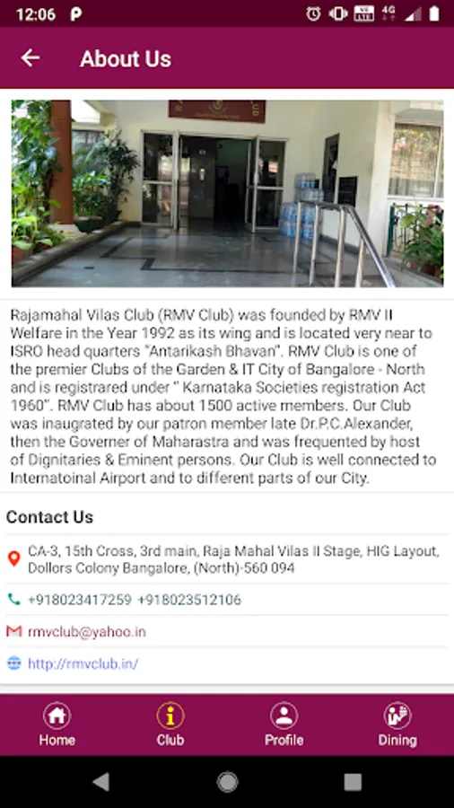 Rajamahal Vilas Club (RMV Club) was founded by RMV II Welfare in the Year 1992 as its wing and is located very near to ISRO head quarters “Antarikash Bhavan”. RMV Club is one of the premier Clubs of the Garden & IT City of Bangalore - North and is registrared under “ Karnataka Societies registration Act 1960”. RMV Club has about 1500 active members. Our Club was inaugrated by our patron member late Dr.P.C.Alexander, then the Governer of Maharastra and was frequented by host of Dignitaries & Eminent persons. Our Club is well connected to Internatoinal Airport and to different parts of our City.