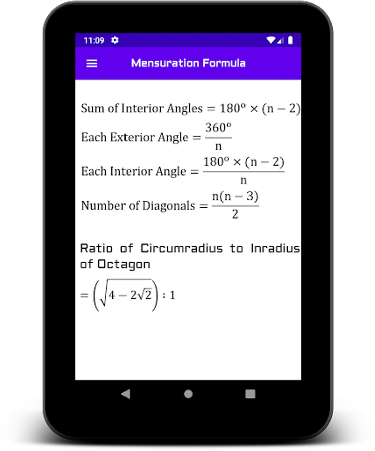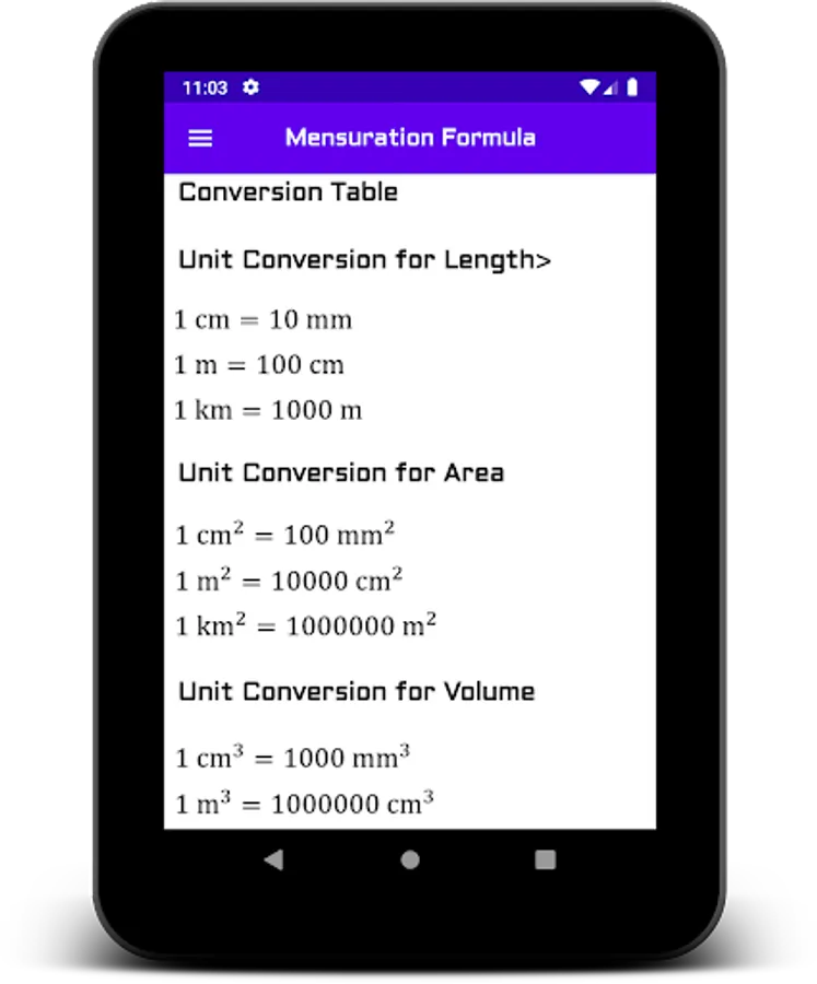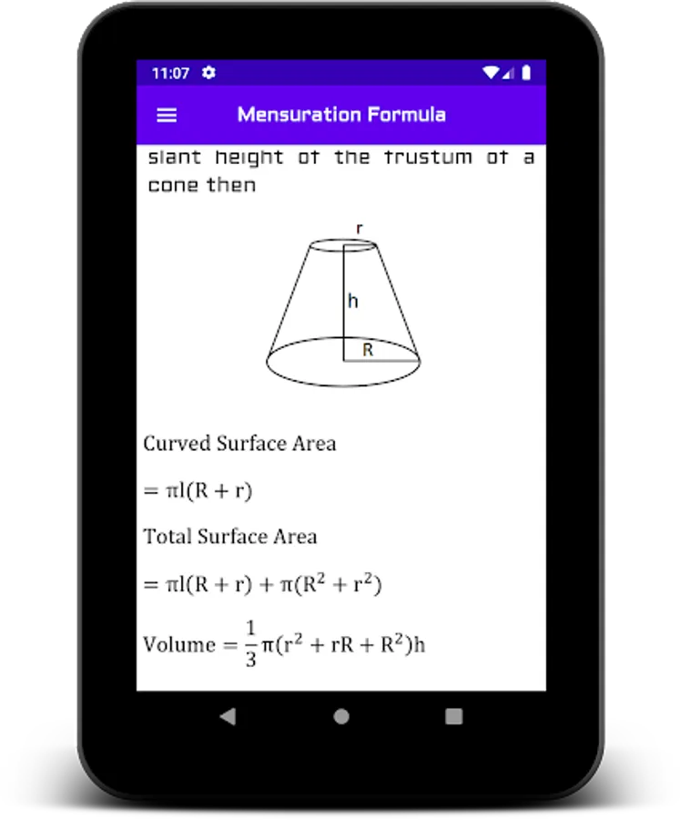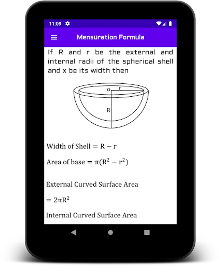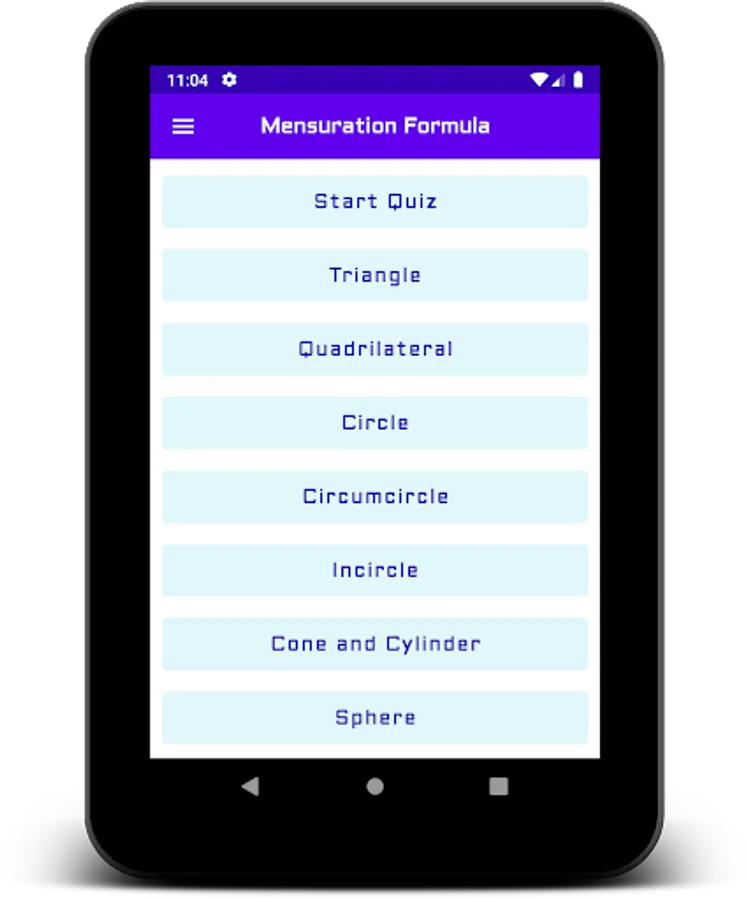 Mensuration Formula App is an Online App. This App contains more than 140 formulas to calculate Perimeter , Total surface Area, Lateral Surface Area, Circumference, Radius, Diameter and Volume of different Plane and Solid diagrams. This app contains formula of following Plane and Solid figures. Now a Quiz section has also been added.