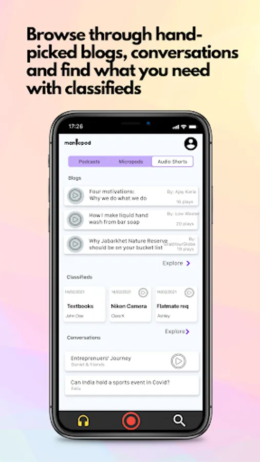 - Audio shorts: Why read when you can listen to blogs? Check out our collection of handpicked blogs. Learn new things by listening to some of the greatest minds having conversations. You can also find what you need using classifieds.