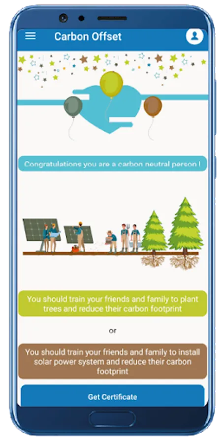 Be Carbon Neutral Mobile platform is a user-friendly mobile application designed to assess carbon footprint and carbon neutrality of individuals and groups. The system provides a quick and immediate interface to compute Carbon Footprint, Carbon Neutrality and Carbon Offset on analytical tools and support services. Based on the carbon offset balance, user is certified to encourage his friends and family for reducing carbon footprint or is advised to adopt CO2 reduction techniques like plantation and solar energy. The app is also a single point of access to reduce carbon dioxide emissions by adopting sustainable practices on a daily basis.