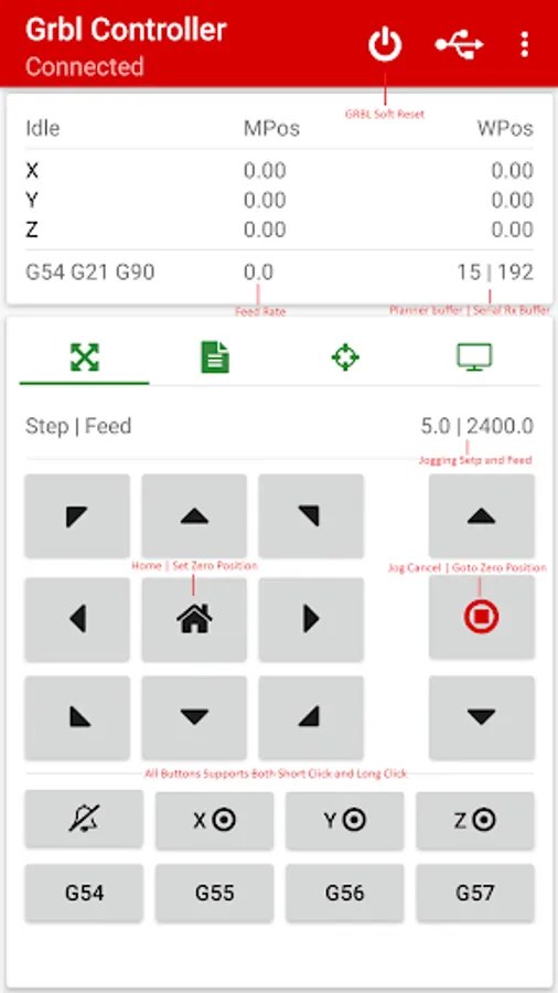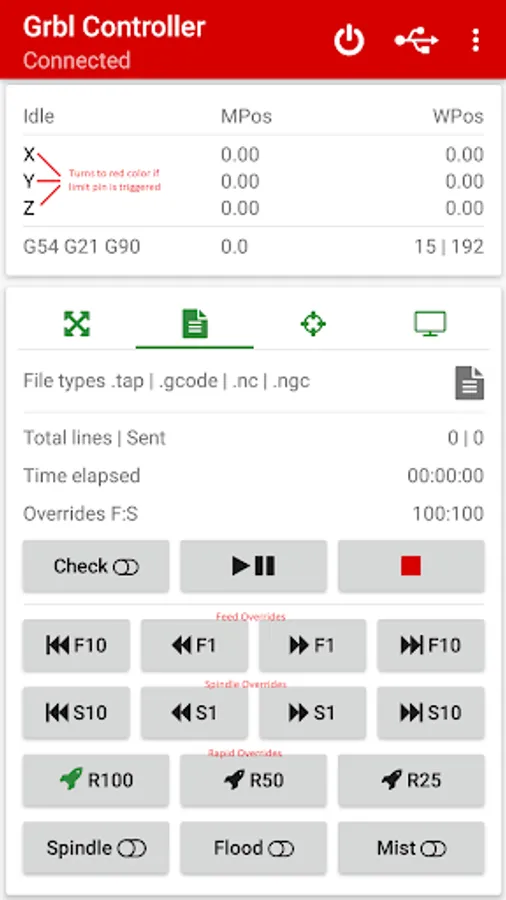 * Supports Grbl 1.1 real time feed, spindle and rapid overrides.